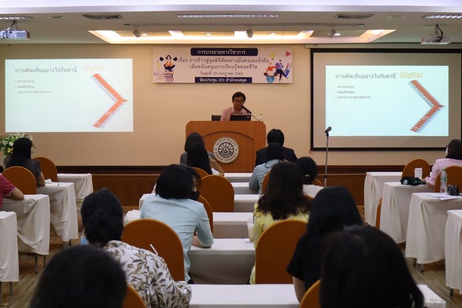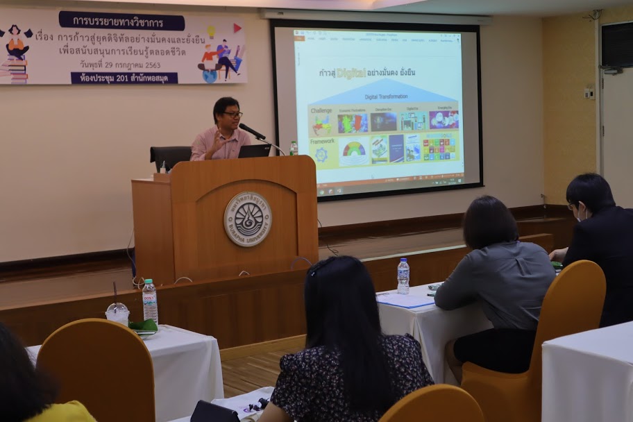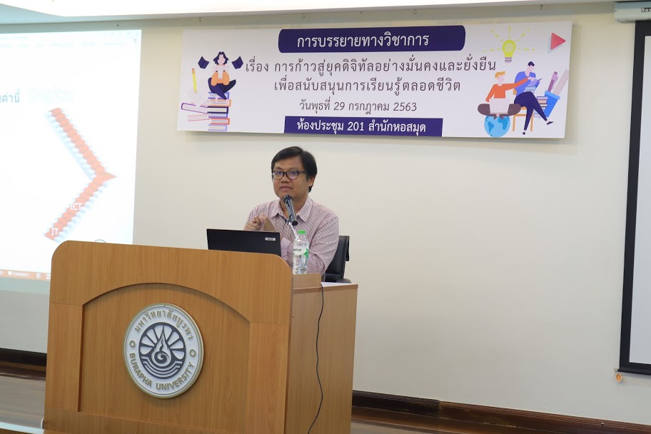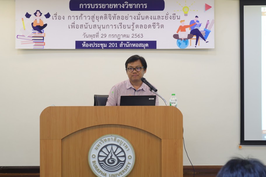 BUU Library held a training project “Stepping Towards a Stable and Sustainable Digital Age to Support Lifelong Learning” for library staff so that they can gain knowledge and understand about digital technology and laws including how to develop the library to become a stable and sustainable digital library by the speaker, Lec. Boonlert Aroonpiboon, the director of Science and Technology Knowledge Services: STKS, National Science and Technology Development Agency (NSTDA) on 29 July 2020 at the meeting room 201 on the 2nd floor
