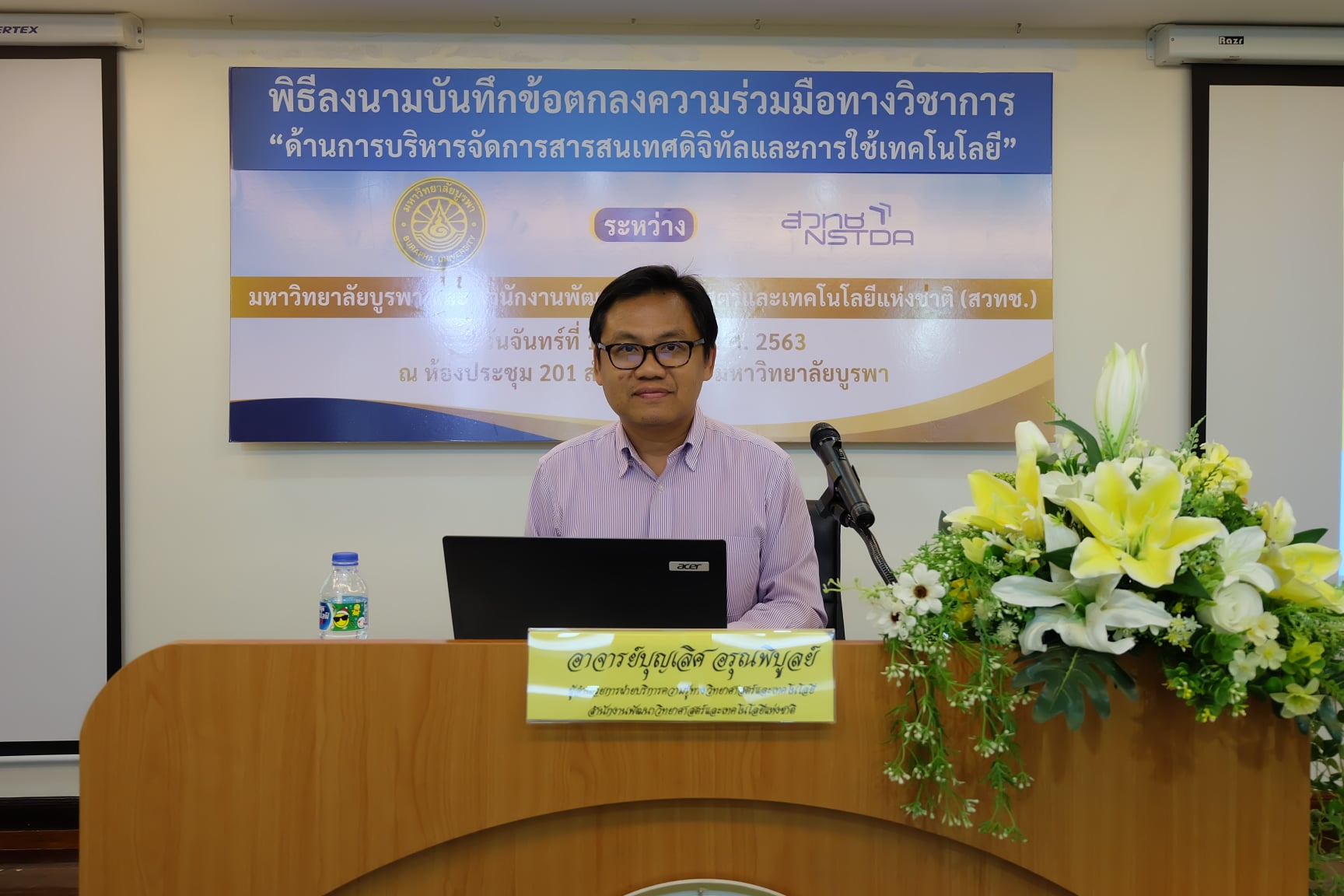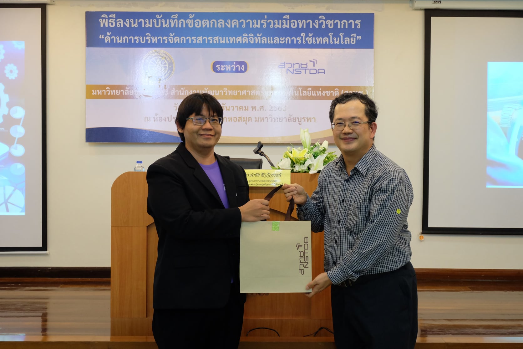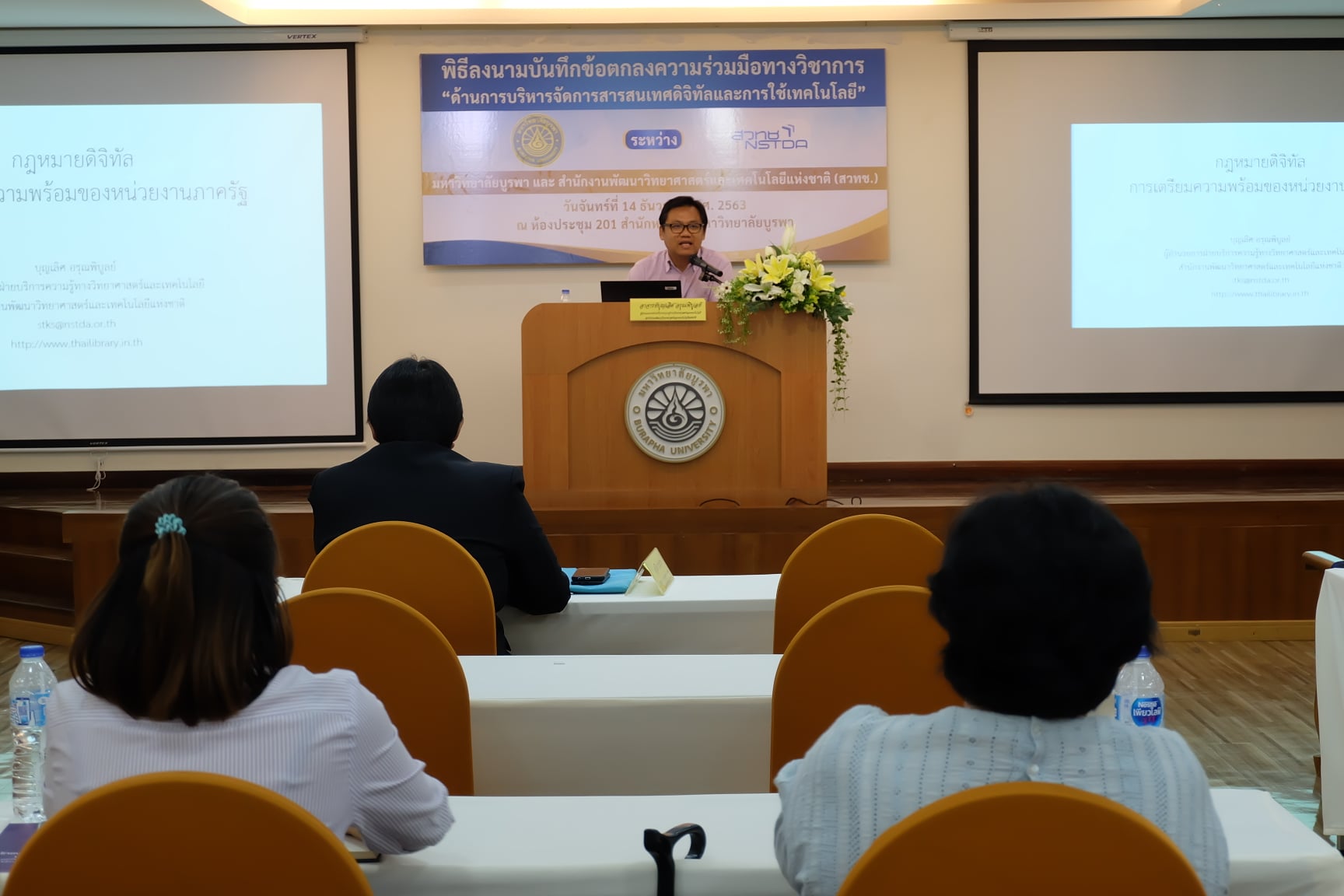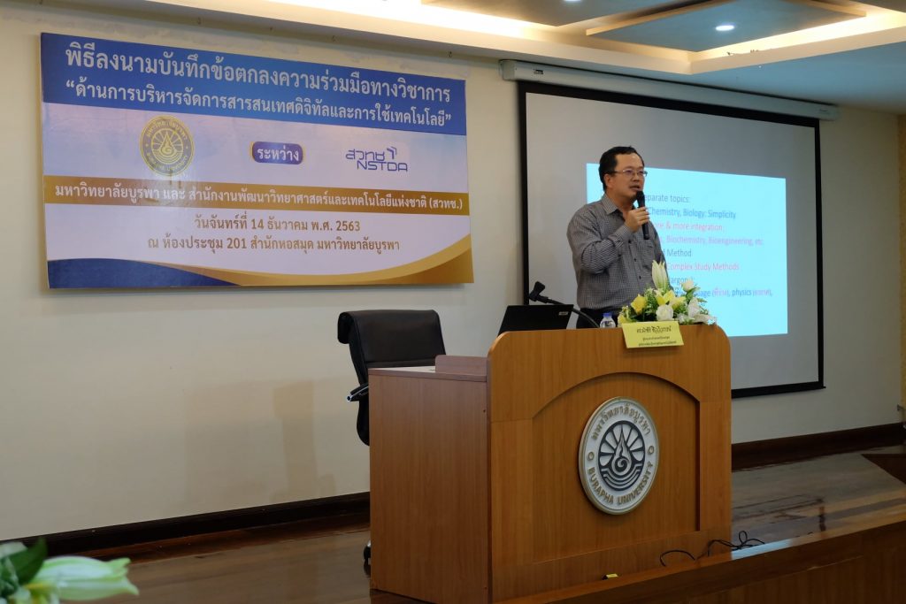 Burapha University Library together with National Science and Technology Development Agency (NSTDA) organized an academic lecture with an honor from Dr. Numchai Cheewawiwat, Director of Science Publishing, National Science and Technology Development Agency (NSTDA) to be a special speaker on the topic “Science and Technology Trends in the New Century” Lec. Boonlert Arunpiboon, Director of Science and Technology Knowledge Service along with Dr. Thitima Thambumrung, Senior Academic Officer, Acting Head of Service and Knowledge Management of Science and Technology of Knowledge Service Department gave