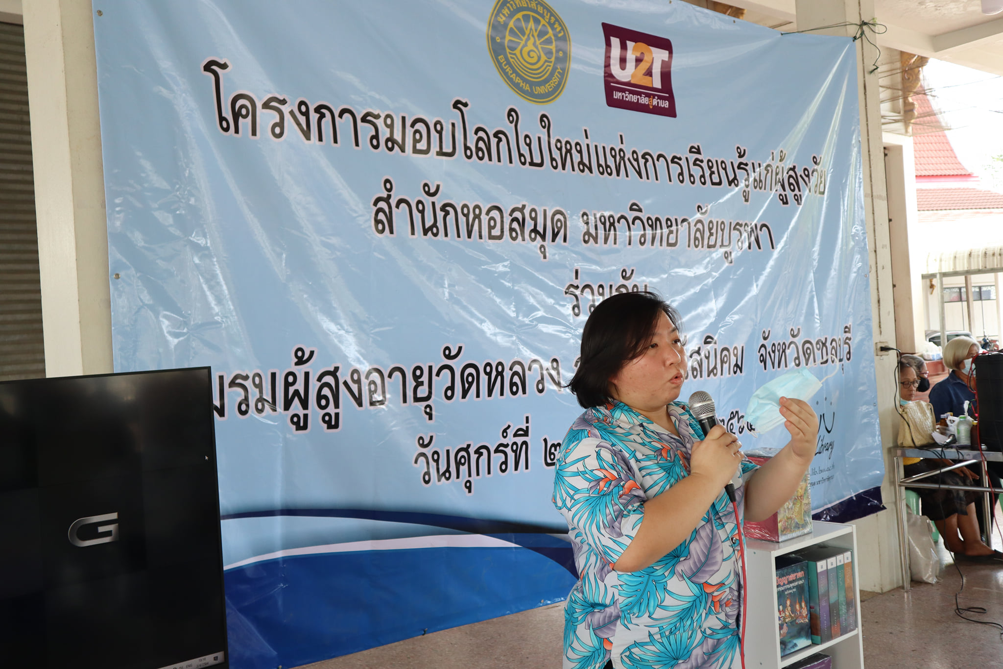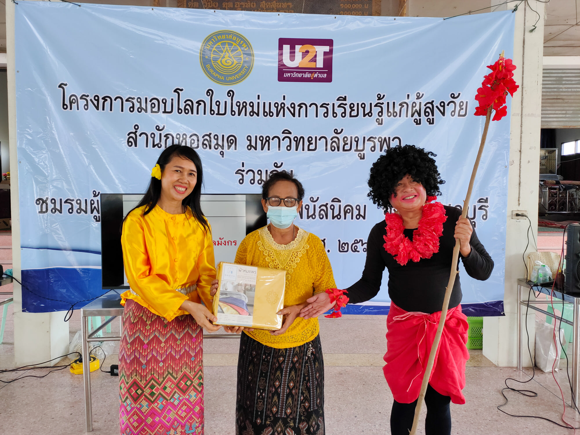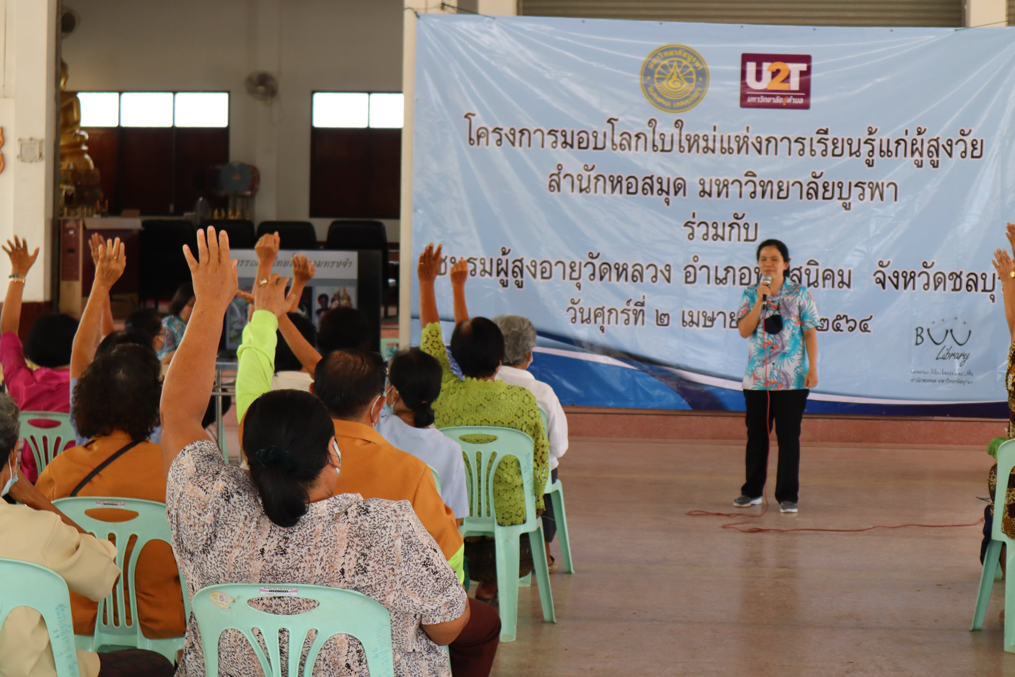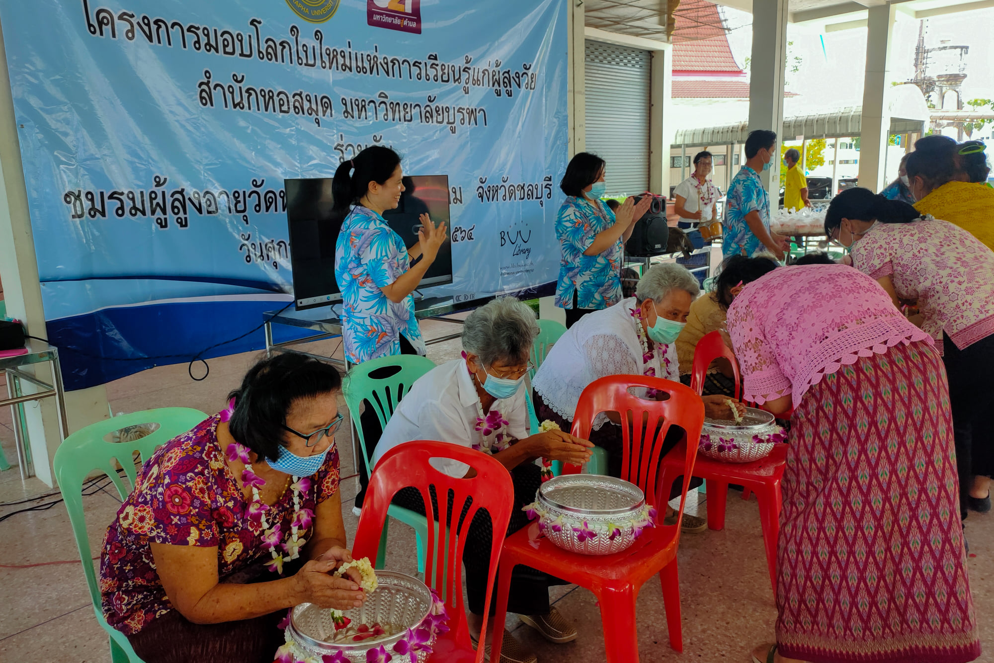 Burapha University Library held a project to give a new world of learning to the elderly under the integrated economic and social elevation project by sub-district, One Tambon One University (U2T) (University to Tambon, Build a taproot for the country): Wat Luang Sub-District by providing information media, holding reading promotion activities, and holding a water pouring ceremony to pray for the participants of the activities from Wat Luang Elderly Club on Songkran festival. This event was held on 2 April 2021 at Phrommawat Temple, Wat Bot Sub-district, Phanat Nikhom District, Chonburi.