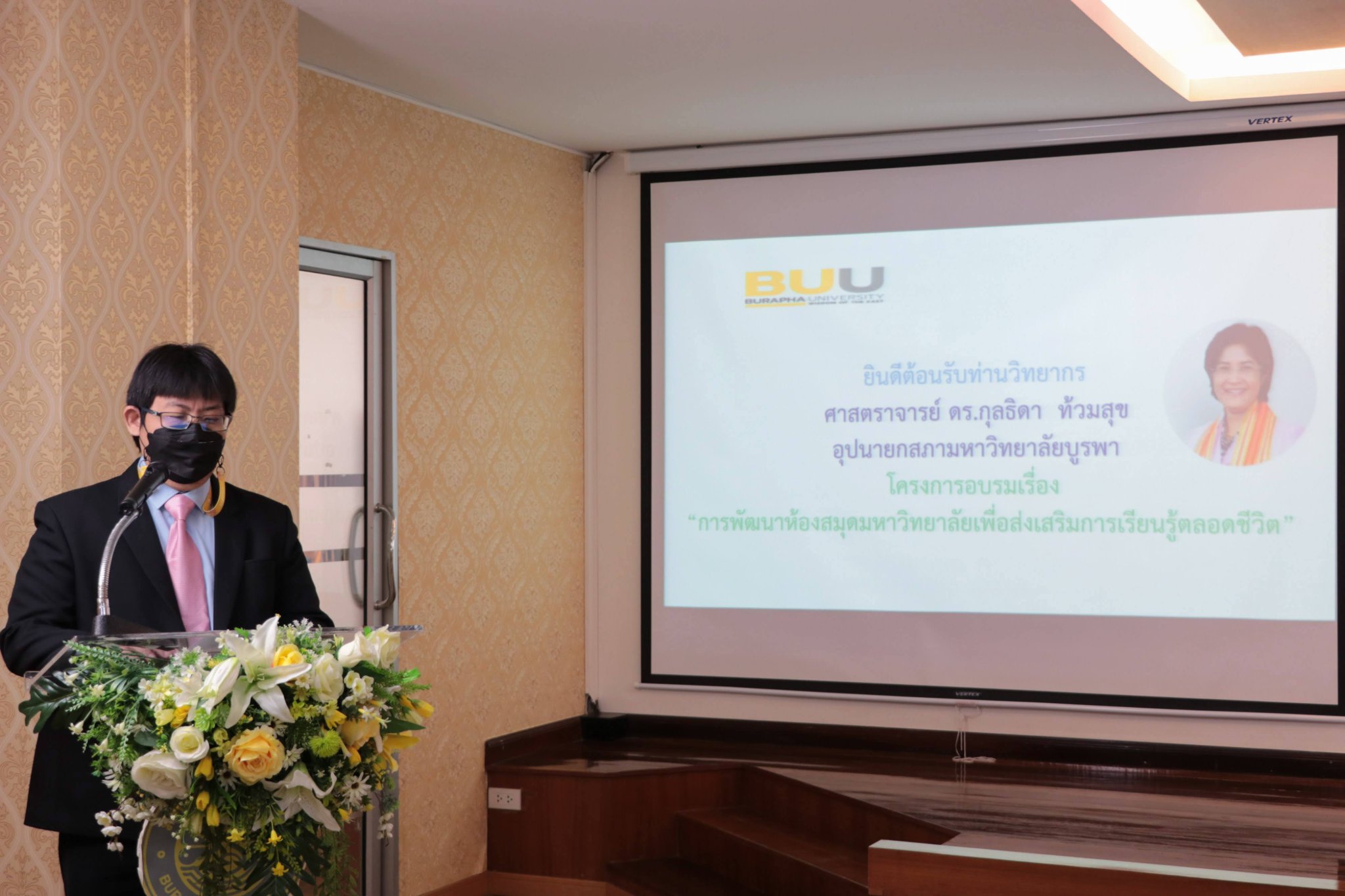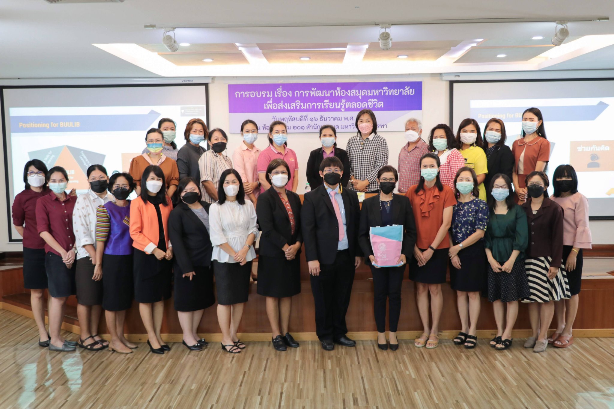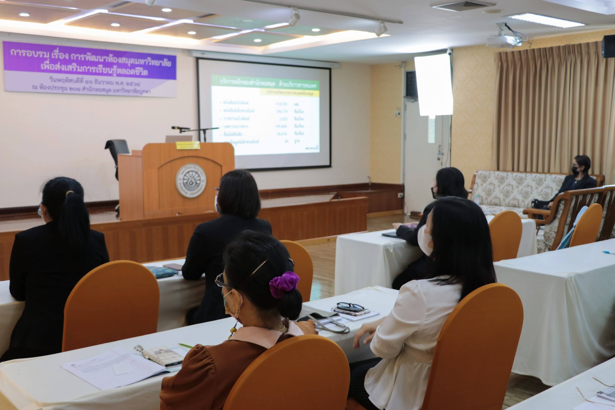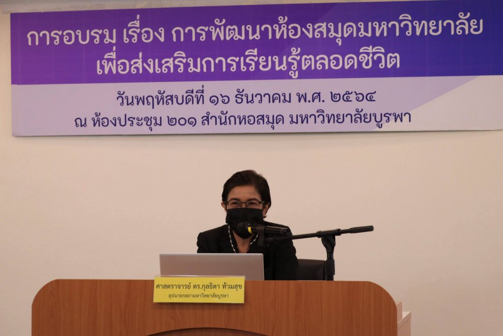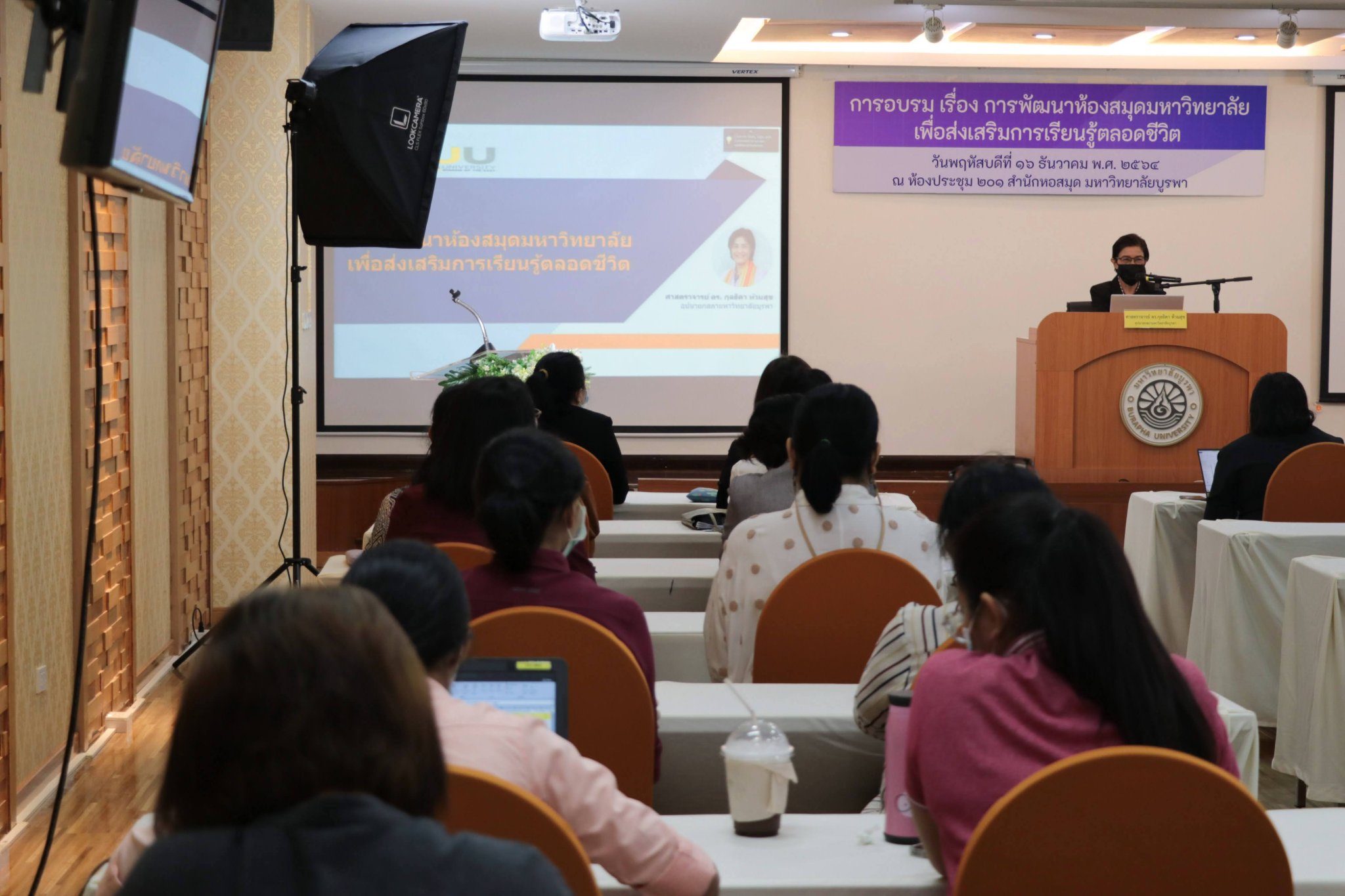 Burapha University Library held a training on “University Library Development to Promote Lifelong Learning” as a guideline for developing library and promoting lifelong learning including developing knowledge, understanding and attitudes of library staff in order to promote the process of lifelong learning by the guest speaker, Prof. Dr. Kultida Tuamsuk, Vice President of Burapha University Council on 16 December 2021 at the meeting room 201 on the 2nd floor of Burapha University Library.