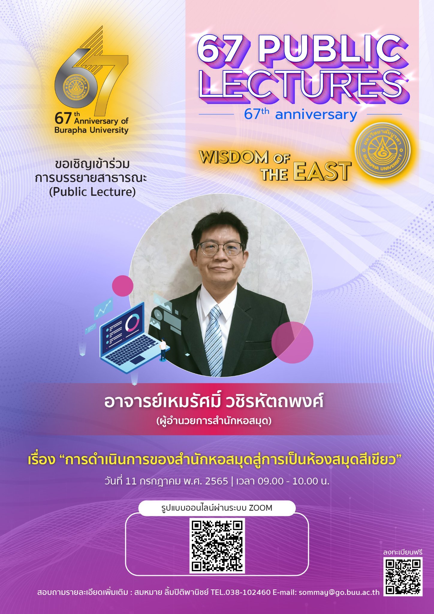 Burapha University Library participated in the public lectures to celebrate the 67th Anniversary of Burapha University: 67th Anniversary 67 Public Lectures: Wisdom of the East oo the topic of “The action of the library to become a green library” by Ajarn Hemmarat Wachirahattapong, the Director of BUU Library on 11 July 2022 from 9:00 – 10:00 a.m.