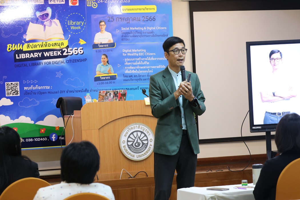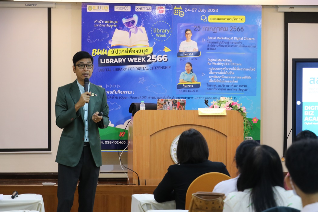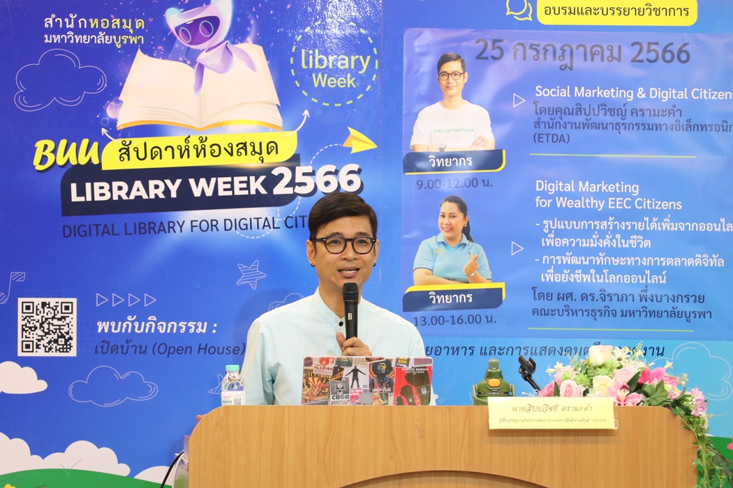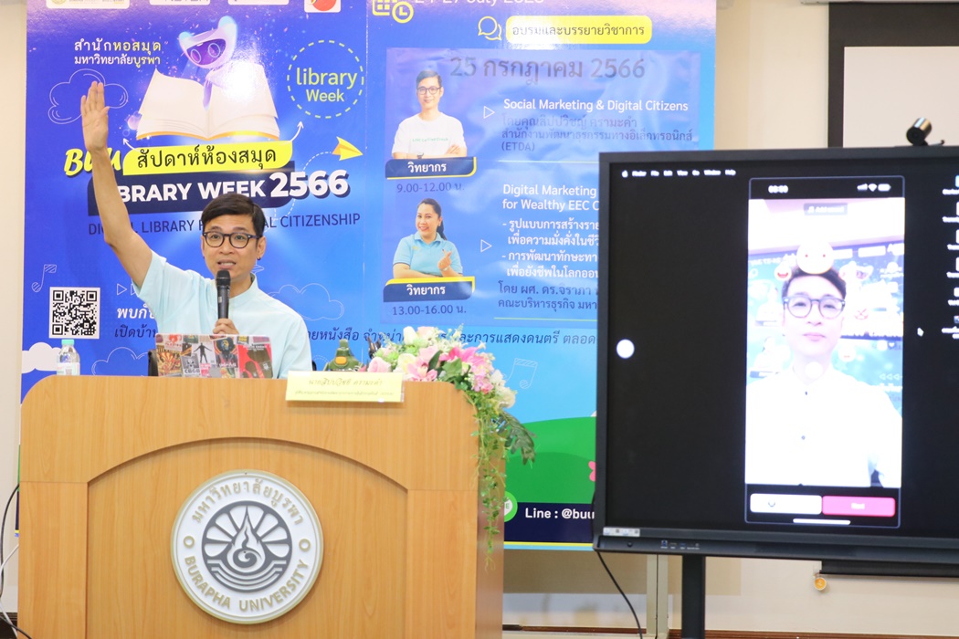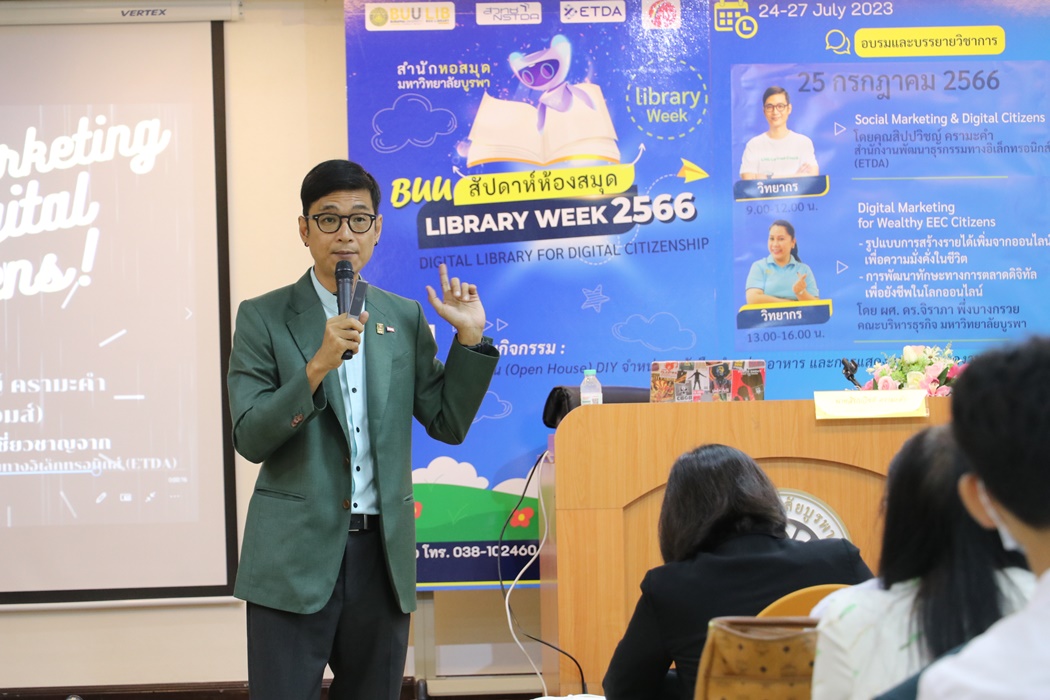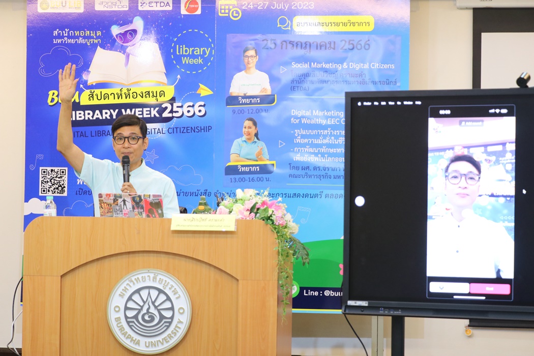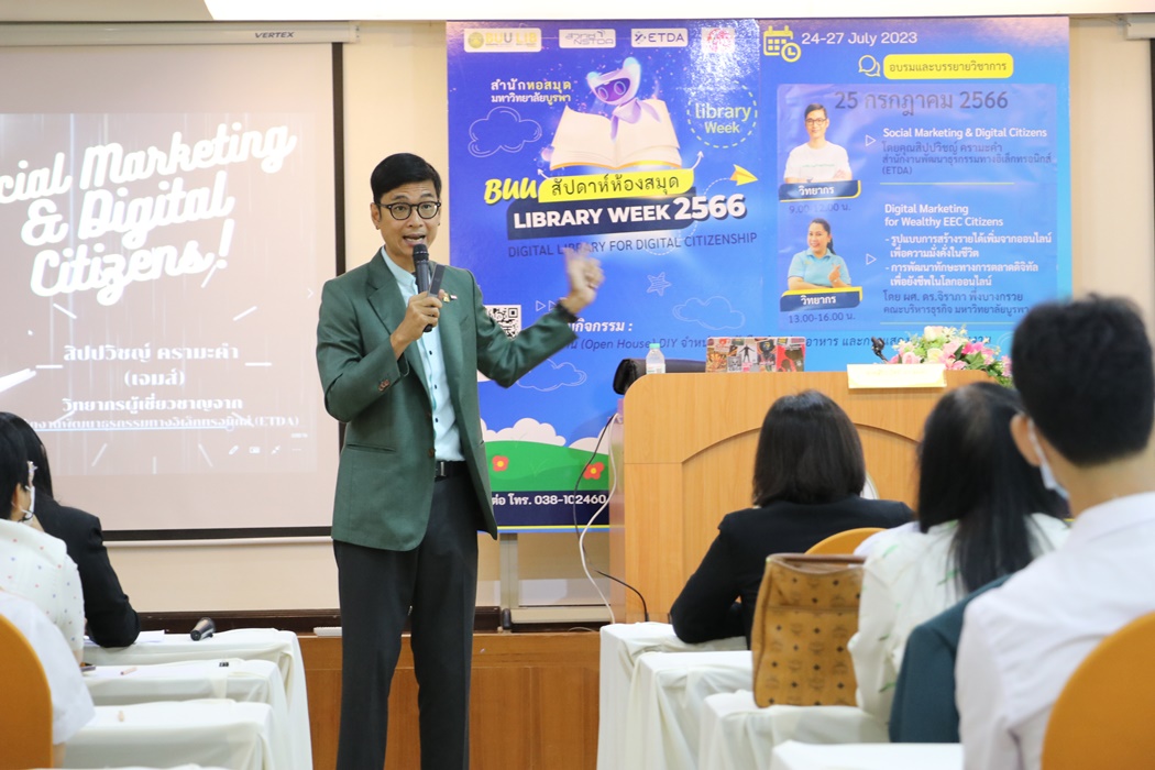 Burapha University Library held the academic lecture on Social Marketing & Digital Citizens at Library Week 2023 by the guest speaker, Mr. Sippawit Kramakam, the expert from the Electronic Transactions Development Agency (ETDA) on 25 July 2023 at 9:00 a.m. – 12:00 p.m. at the meeting room 201 on the 2nd floor of the library.