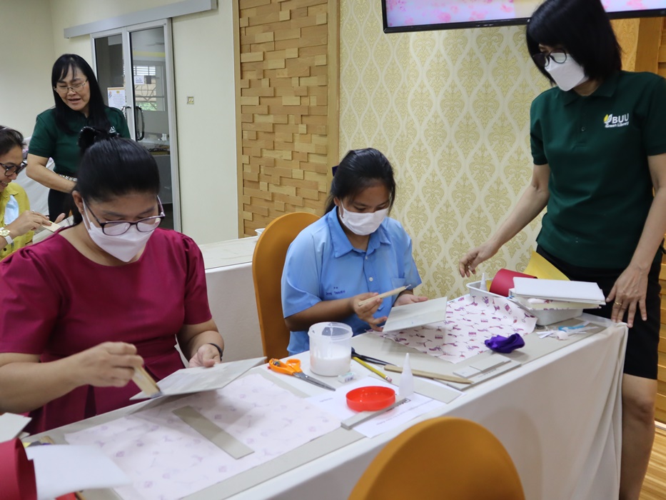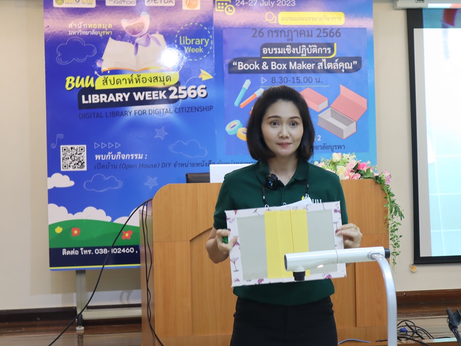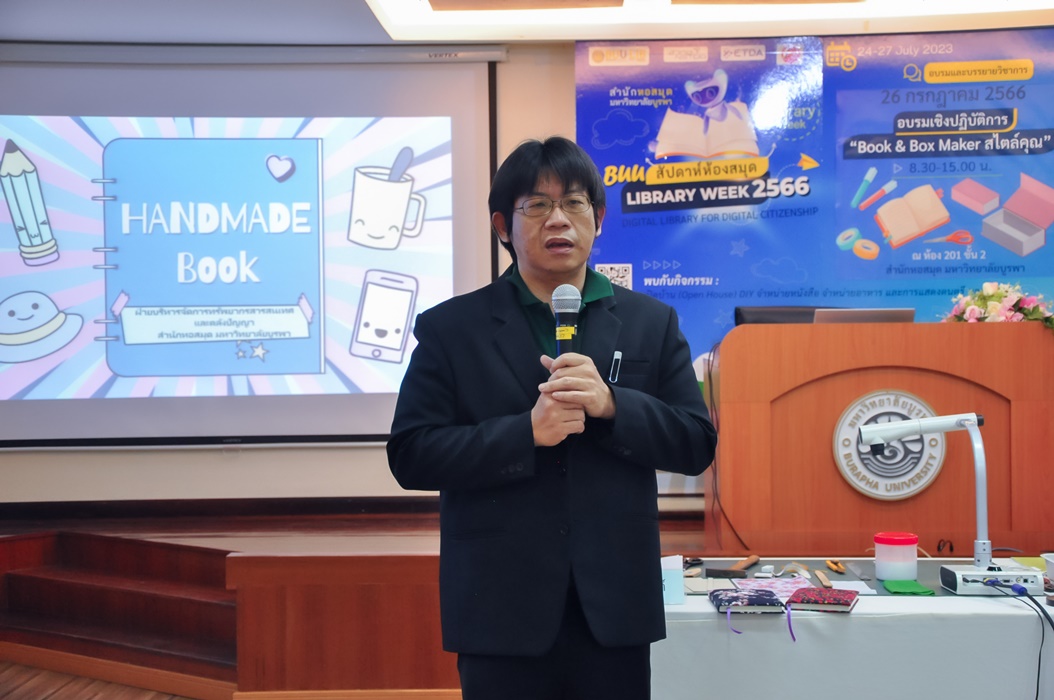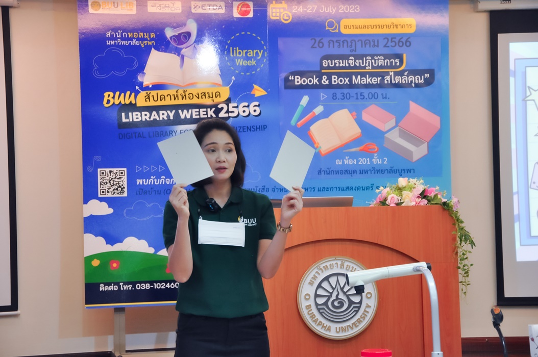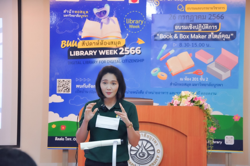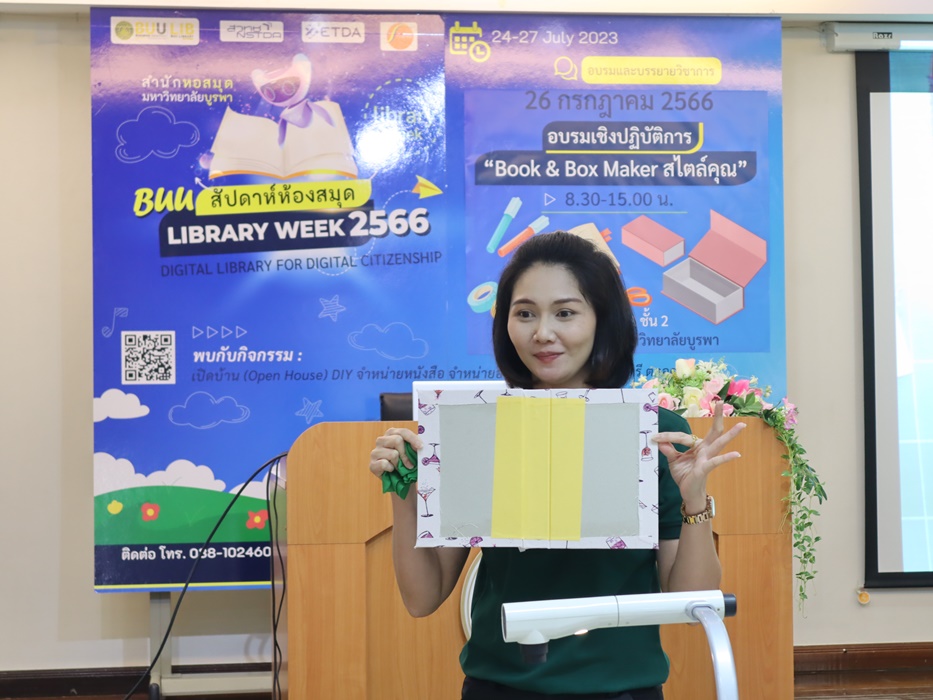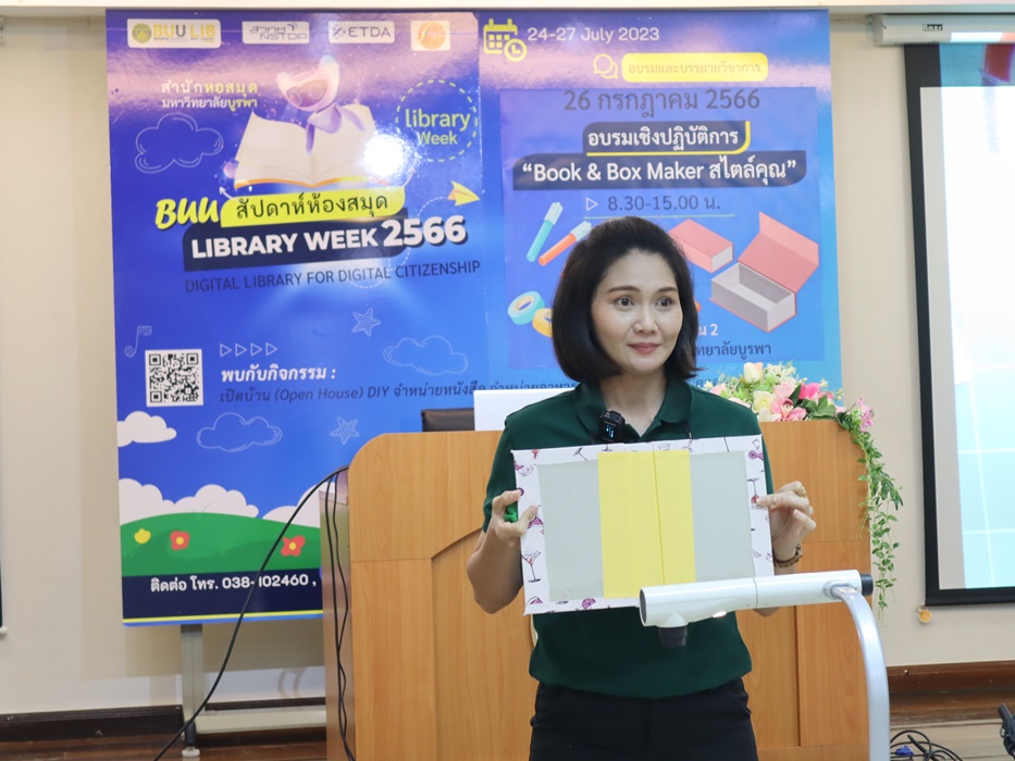 Burapha University Library led by Hemmarat Wachirahatthaphong, the Director of the library, delivered an opening speech of the workshop on “Book & Box Maker in Your Style” at Library Week 2023 on 26 July 2023 from 9:00 a.m. – 3:00 p.m. at the meeting room 201 on the 2nd floor of the library.