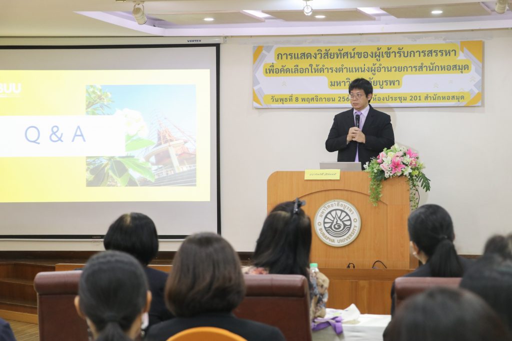 Library personnel and people who were interested participated in listening to the presentation of the vision, policy, and strategic plans for library management by the person who was selected to be a suitable candidate for the position of library director, namely Mr. Hemmarat Wachirahatthapong, on 8 November 2023, in the meeting room 201 on the 2nd floor of Burapha University Library. The selected committee has determined that the vision presentation will not exceed 20 minutes and will answer questions asked by those who were listening to the vision presentation through the selection committee for no more than 10 minutes. When the vision presentation was completed, the candidates for recruitment had an interview with the selected committee for no more than 20 minutes. After that, the selected committee had a meeting to consider and filter to select the person who was suitable to hold the position of library director in order to continue presenting to Burapha University Council.