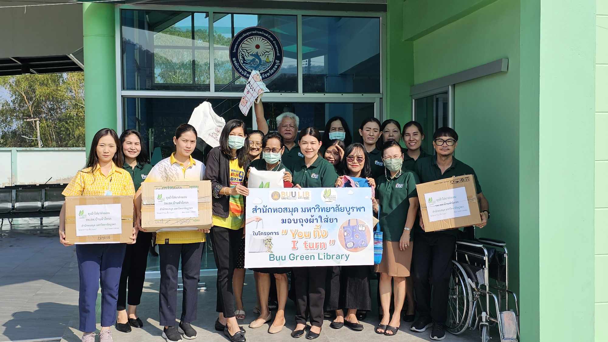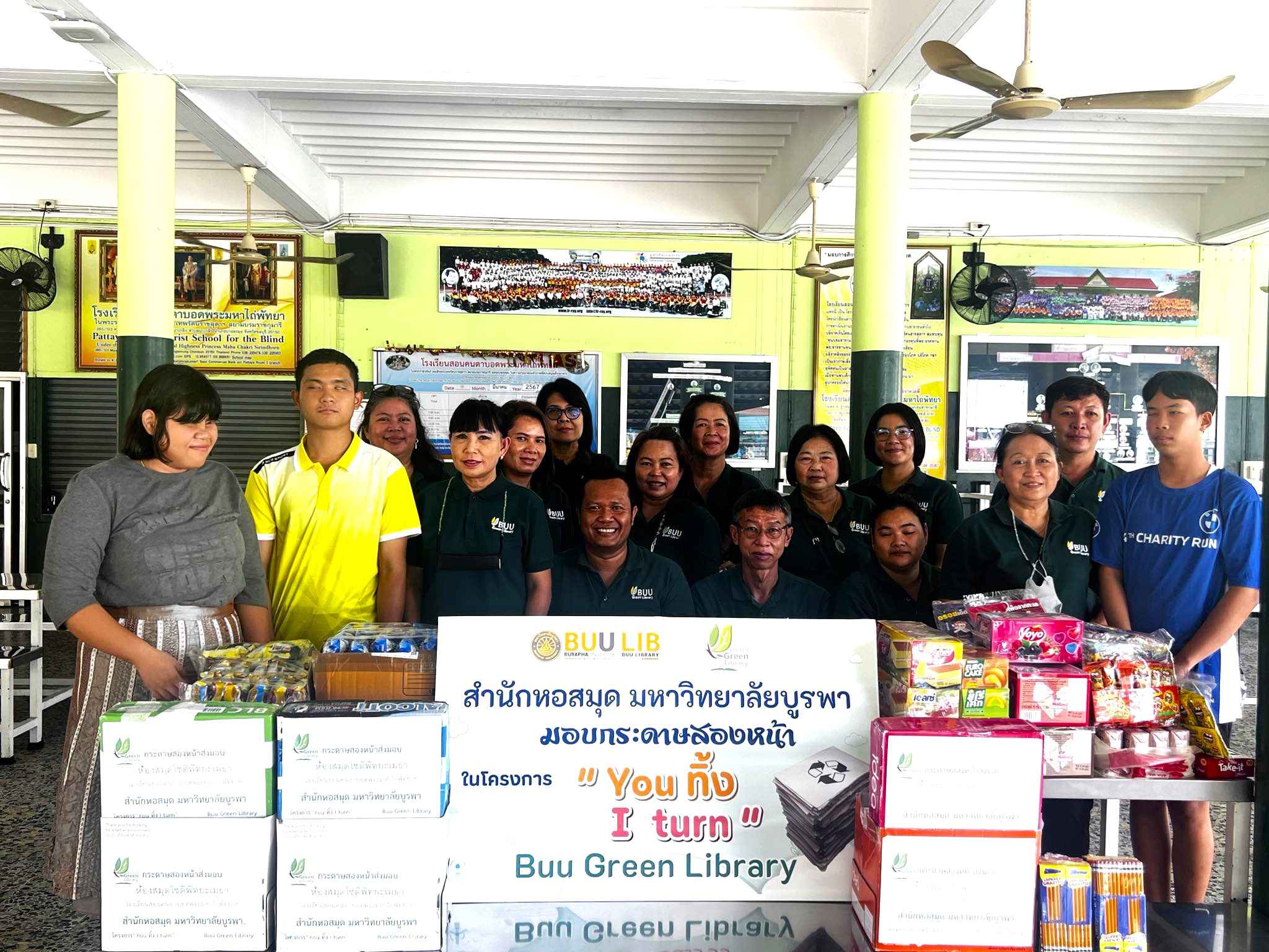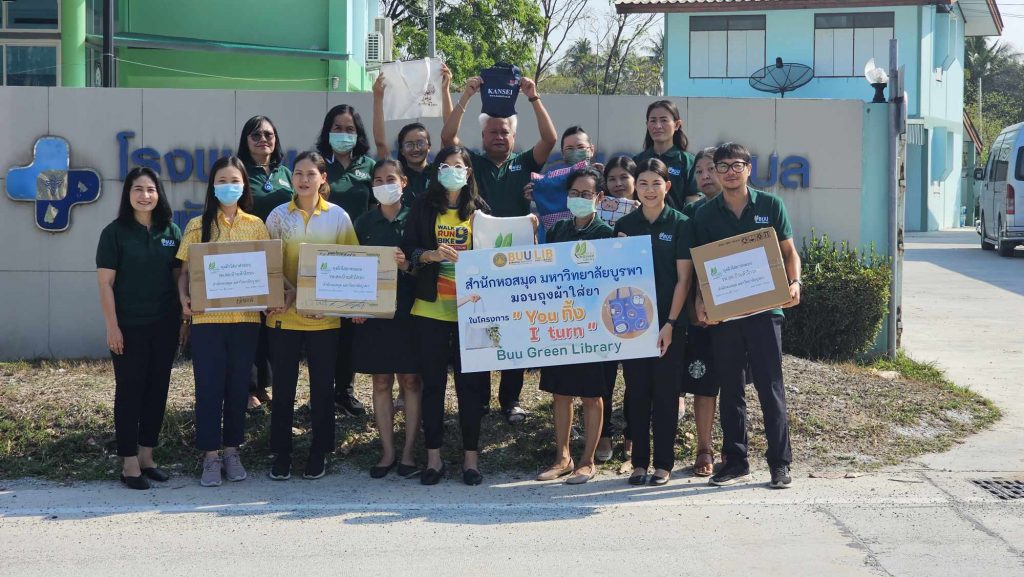 Burapha University Library held “You Throw, I Turn” project, which is a part of Green Library Project. Cloth bags were donated to Ban Huakrok Health Promoting Hospital in Nong Ri Subdistrict, Mueang District, Chonburi Province, to be used for dispensing medication to patients. Additionally, used A4 paper was donated to the Redemptorist School for the Blind in Naklua Subdistrict, Bang Lamung District, Chonburi Province, to be used for educational purposes for visually impaired students. This activity took place on Monday, 25 March 2024.