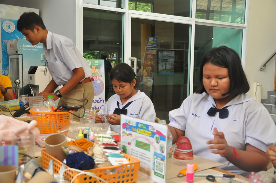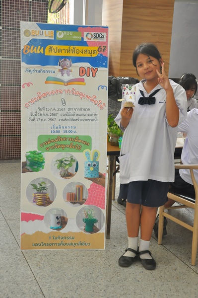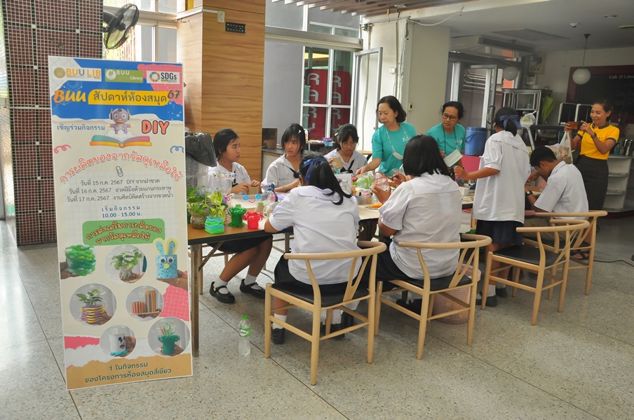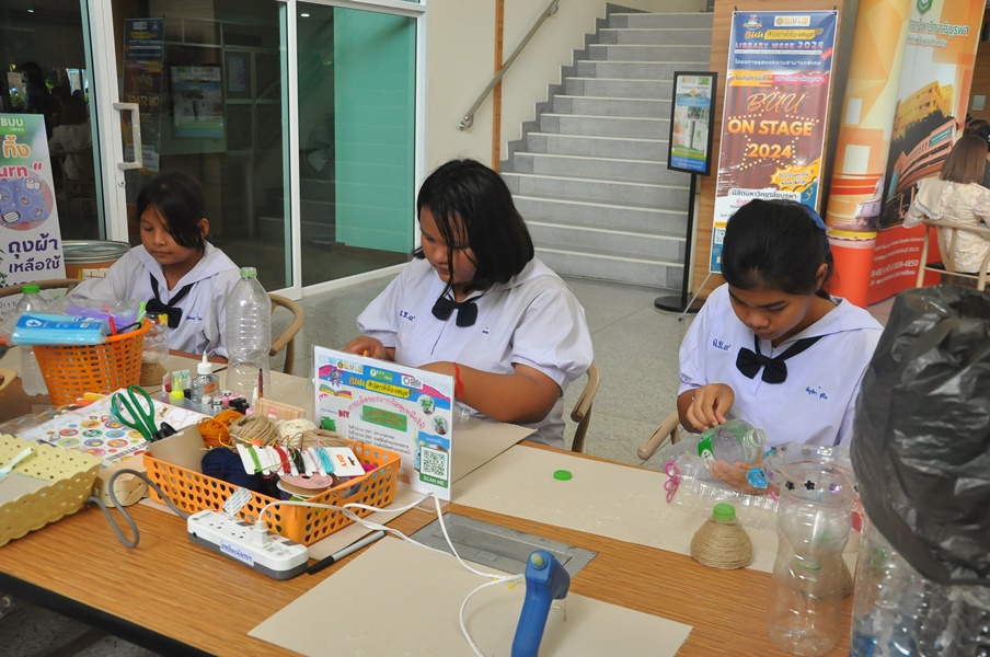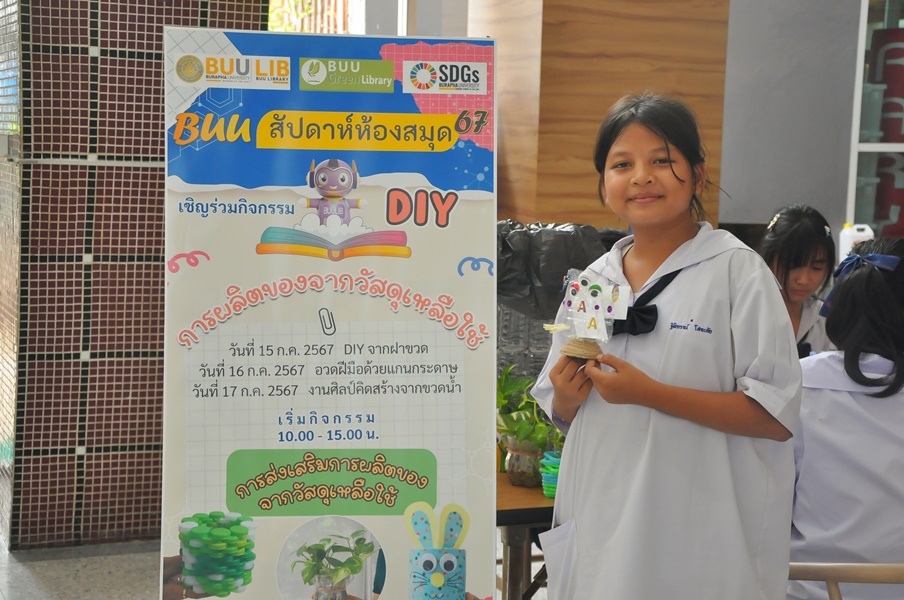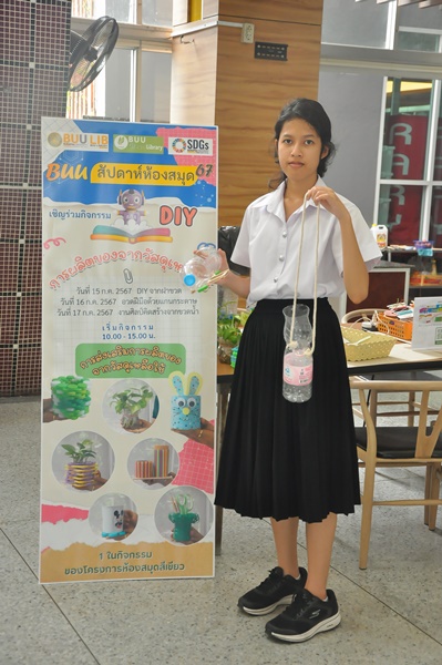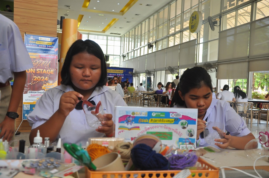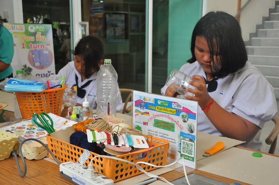Burapha University Library organized a DIY craft-making activity using recycled materials. This event was part of Green Library during Library Week 2024. The activity aimed to encourage creative reuse of waste materials by transforming water bottles into artistic and practical items. Participants completed their projects on-site and were able to take their beautiful creations home. The event was held on 17 July 2024 at the common learning hall on the 1st floor of the library.