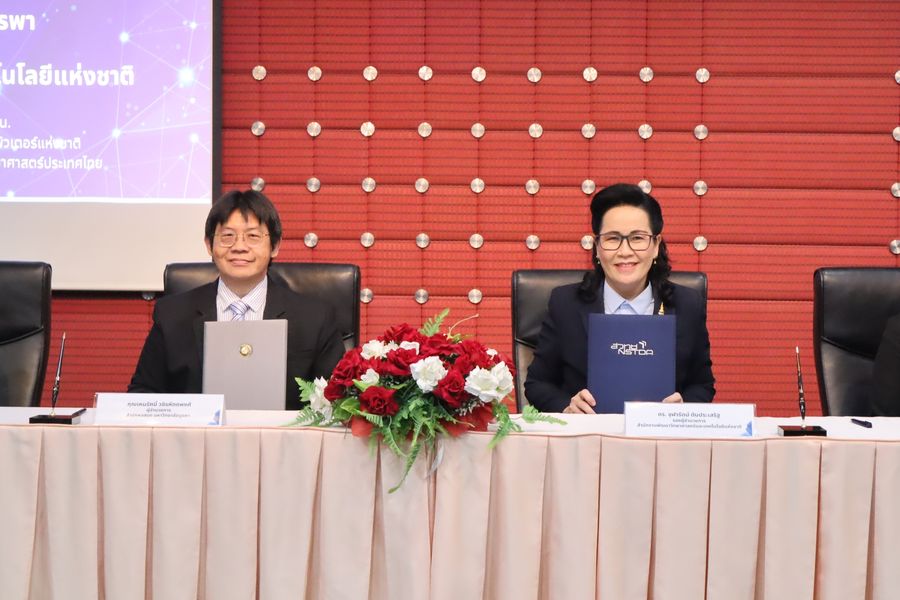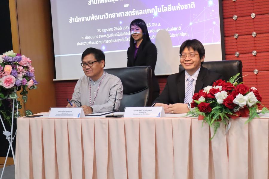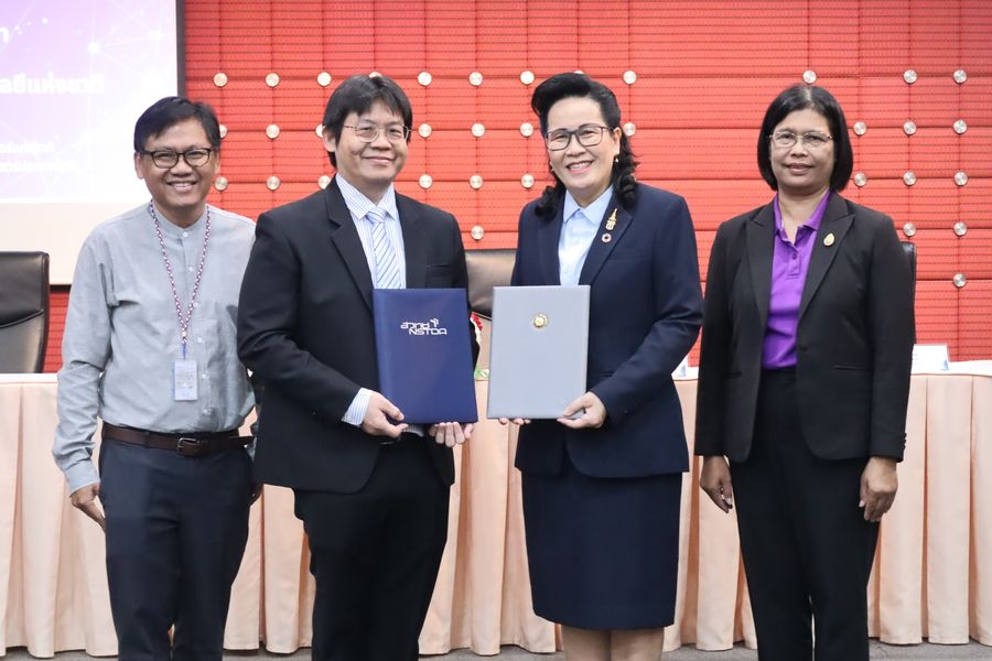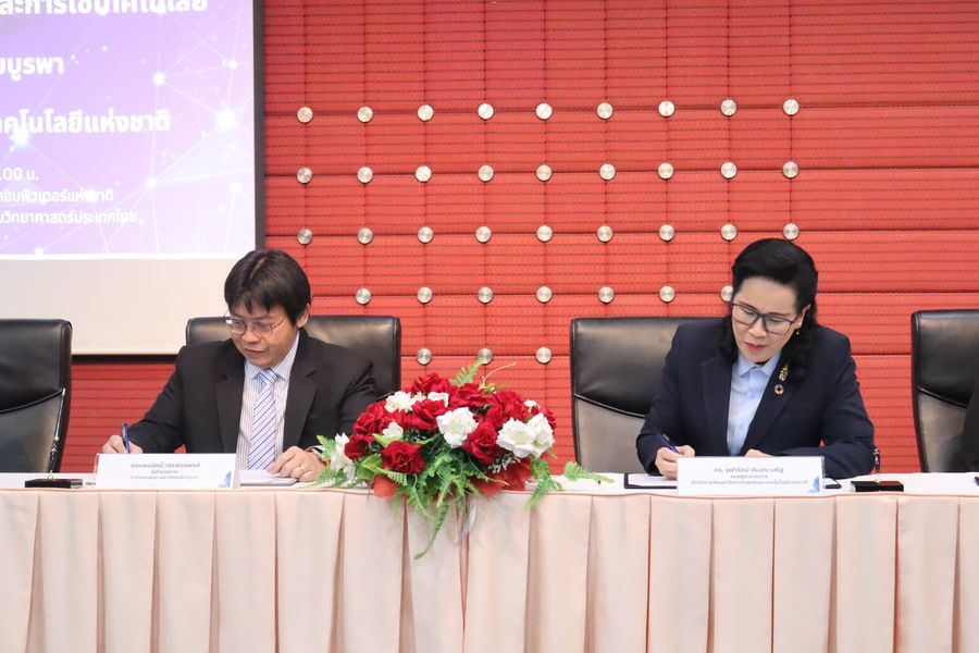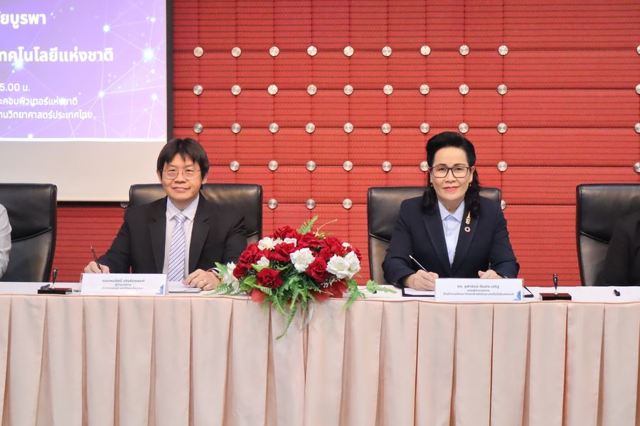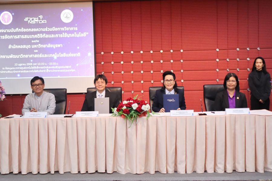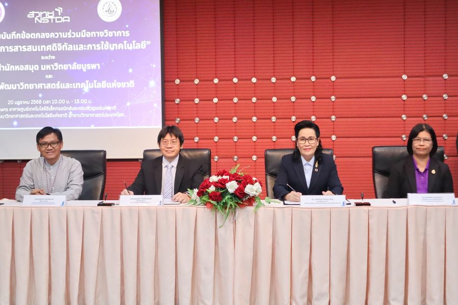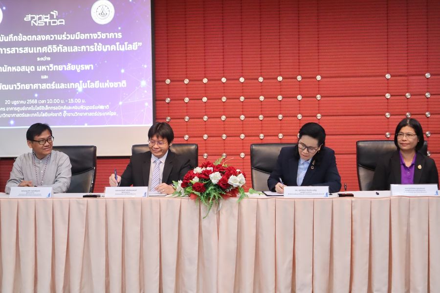 Executives and staff of Burapha University Library participated in the signing ceremony of a Memorandum of Understanding (MOU) on academic cooperation in digital information management and technology utilization between the National Science and Technology Development Agency (NSTDA) and Burapha University Library. Key representatives in the ceremony included Dr. Chularat Tanprasert, the Deputy Executive Director for Strategic Management of NSTDA; Mr. Boonlert Arunpiboon, the Director of the Science and Technology Knowledge Services Division; Mr. Hemmarat Wachirahatthapong, the Director of Burapha University Library; and Mrs. Watchareeporn Khunsanong, the Deputy Director for Academic Affairs of the library. The collaboration aims to promote and support academic cooperation, knowledge exchange, and the exploration of appropriate tools for knowledge management through suitable technologies. It also encourages the shared use of information resources and facilities in a strong and sustainable manner. The signing ceremony was held on January 20, 2025, at the Bussakorn Room, National Electronics and Computer Technology Center (NECTEC), NSTDA, Thailand Science Park.
