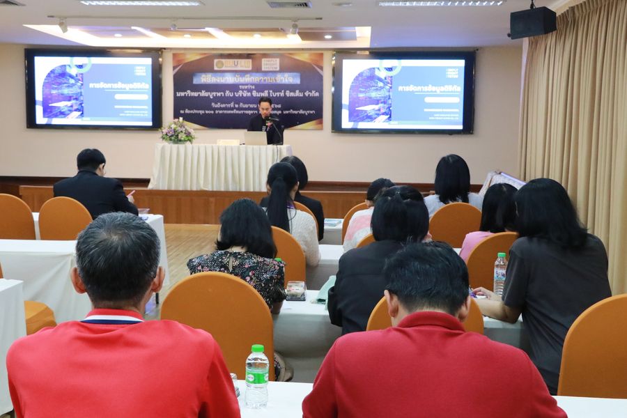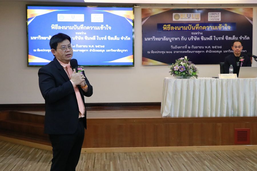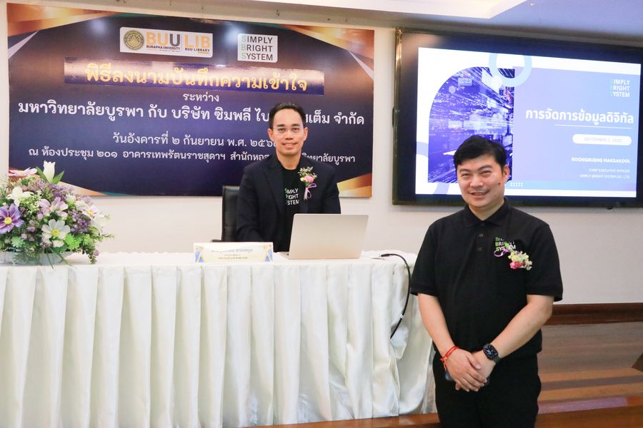 Burapha University Library held a signing ceremony for a Memorandum of Understanding (MOU) between Burapha University Library and Simply Bright System Co., Ltd. The MOU was signed by Lec. Hemmarat Wachirahattapong, the Director of the University Library and representative of the President of Burapha University, and Mr. Rungrueng Maksakun, Managing Director of Simply Bright System Co., Ltd. The agreement aims to foster academic knowledge exchange, innovation, and related technologies to enhance wisdom and apply organizational expertise for the benefit of local communities and society in the Eastern region. It also focuses on supporting and promoting the digital development of Burapha University students and staff. On this occasion, Mr. Rungrueng Maksakun also delivered a special lecture on “Digital Data Management and DOI Service System Introduction” on September 2, 2025 at the meeting room 201 of the library.