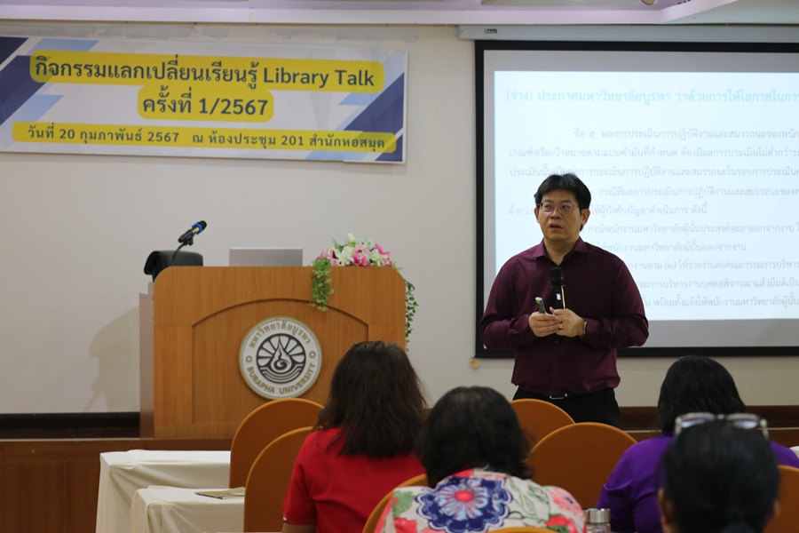 สำนักหอสมุด มหาวิทยาลัยบูรพา นำโดยอาจารย์เหมรัศมิ์ วชิรหัตถพงศ์ ผู้อำนวยการสำนักหอสมุด เป็นประธานกล่าวเปิดกิจกรรมแลกเปลี่ยนเรียนรู้ Library Talk ครั้งที่ 1/2567 พร้อมทั้งถ่ายทอดแผนยุทธศาสตร์ของสำนักหอสมุดให้บุคลากรได้ทราบ รวมถึงกิจกรรมแลกเปลี่ยนเรียนรู้ของบรรณารักษ์และนักเอกสารสนเทศงานบริการตอบคำถามและช่วยการค้นคว้าเพื่อยกระดับการบริการให้เกิดประสิทธิภาพสูงสุด เมื่อวันที่ 20 กุมภาพันธ์ 2567 ณ ห้องประชุม 201 สำนักหอสมุด