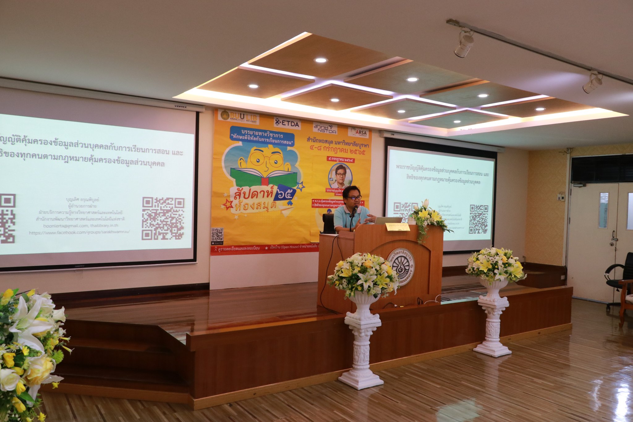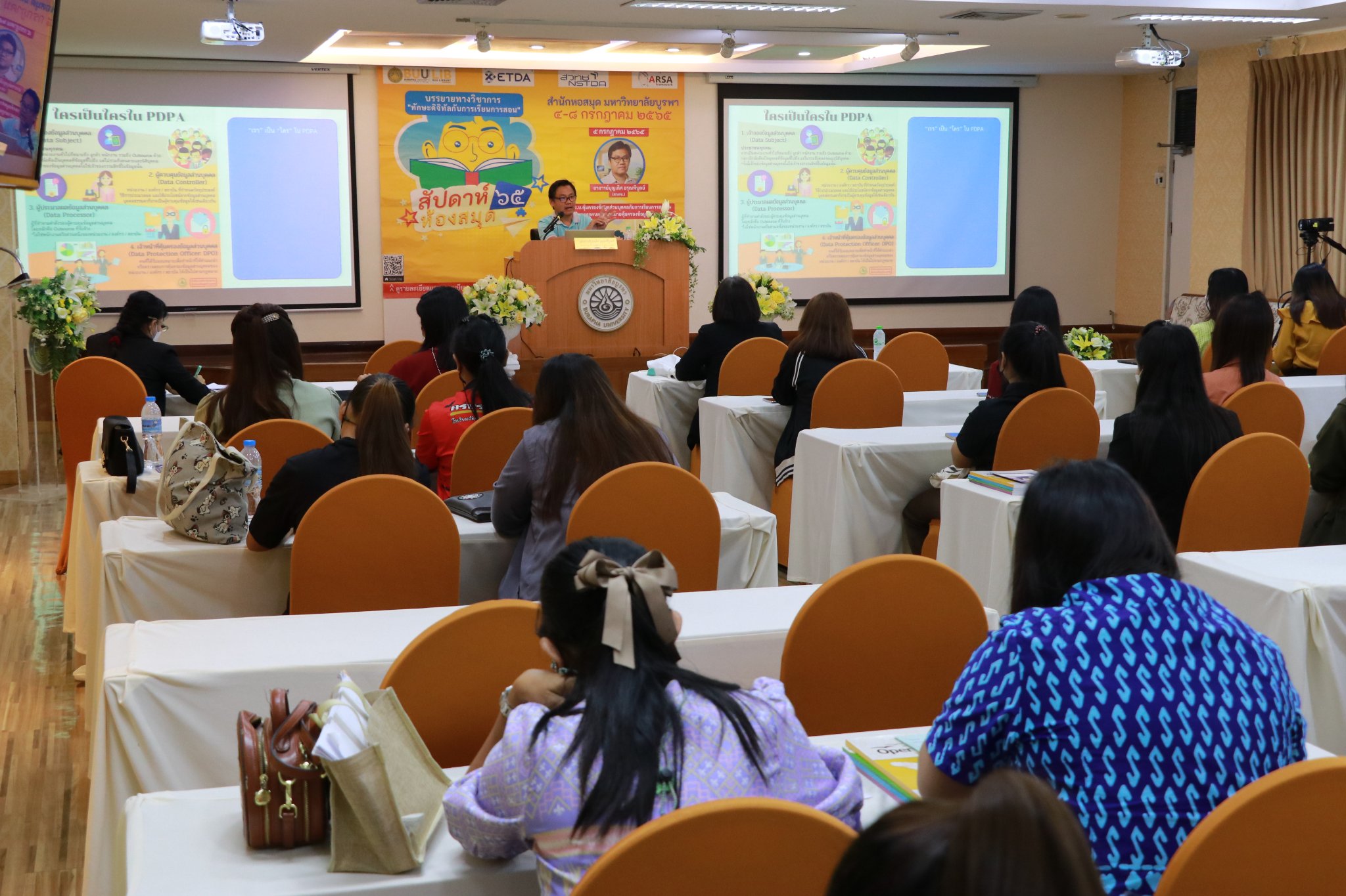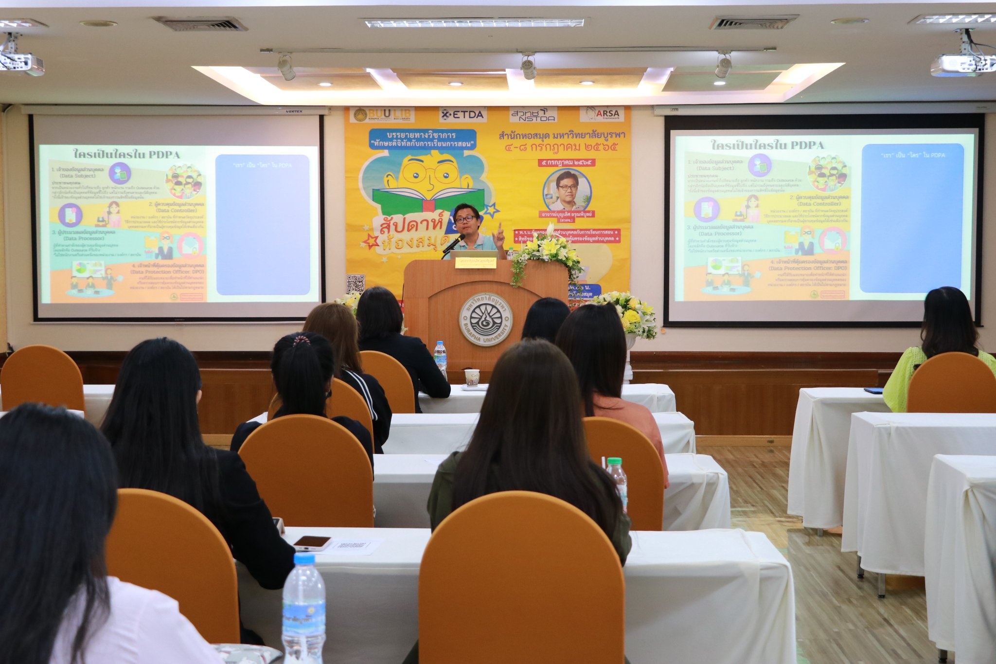 สำนักหอสมุด มหาวิทยาลัยบูรพา ได้จัดการบรรยายทางวิชาการ เรื่อง พ.ร.บ.คุ้มครองข้อมูลส่วนบุคคลกับการเรียนการสอน ภายใต้งานสัปดาห์ห้องสมุด ประจำปี 2565 โดยอาจารย์บุญเลิศ อรุณพิบูลย์ ผู้อำนวยการฝ่ายบริการความรู้ทางวิทยาศาสตร์และเทคโนโลยี (STKS) สำนักงานพัฒนาวิทยาศาสตร์และเทคโนโลยีแห่งชาติ (สวทช.) เมื่อวันที่ 5 กรกฎาคม 2565 เวลา 09.00 – 12.00 น. ณ ห้องประชุม 201 ชั้น 2 และผ่านระบบ Zoom meeting
