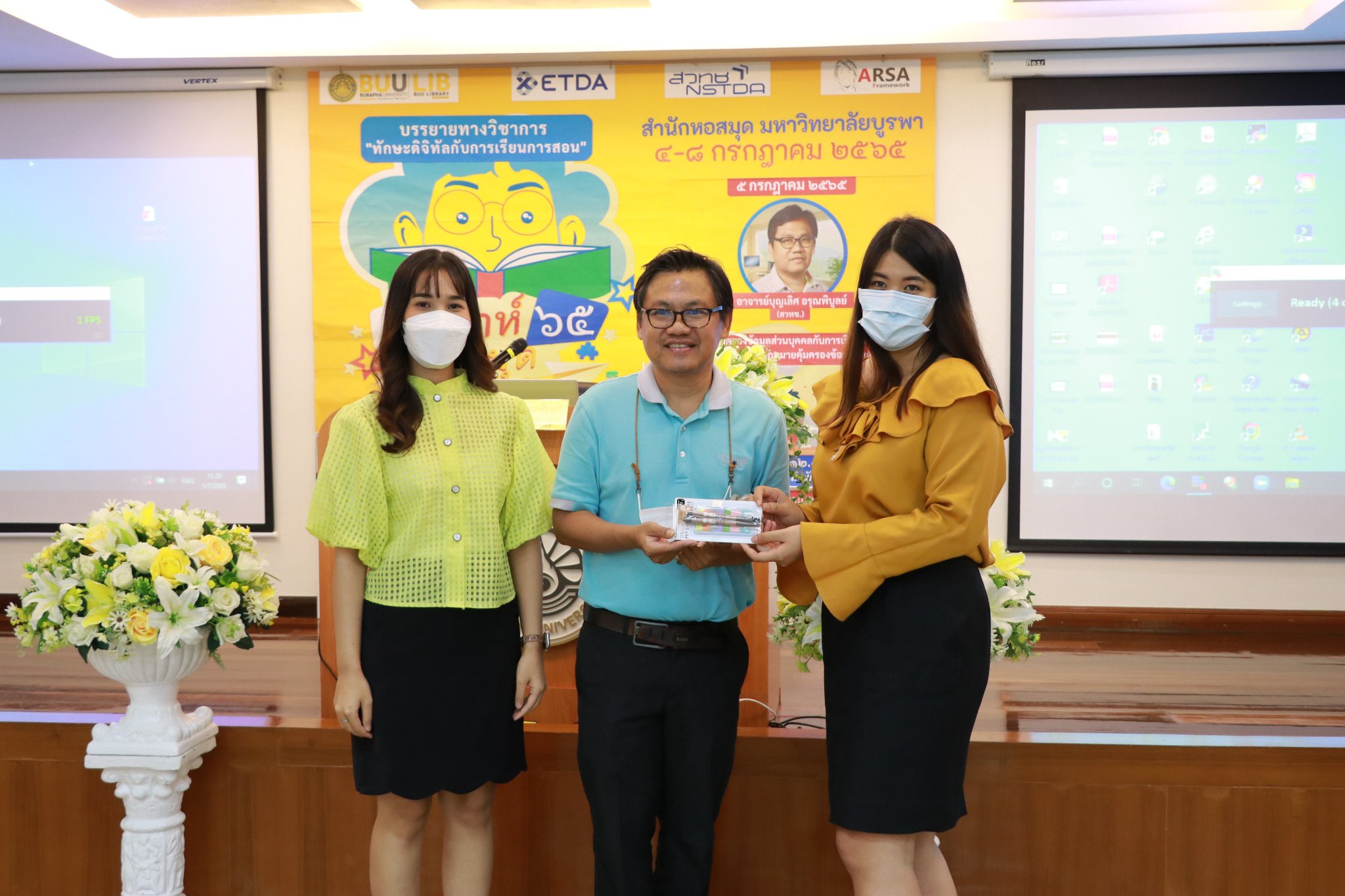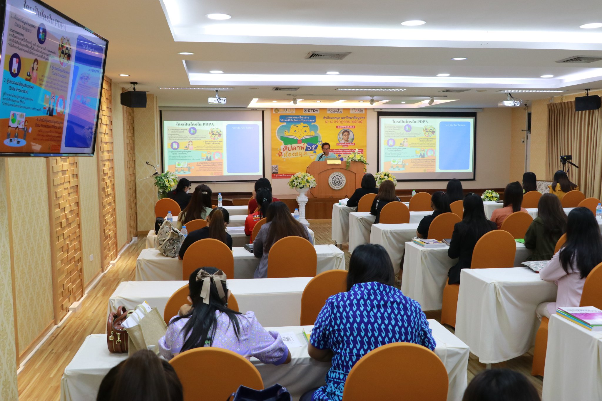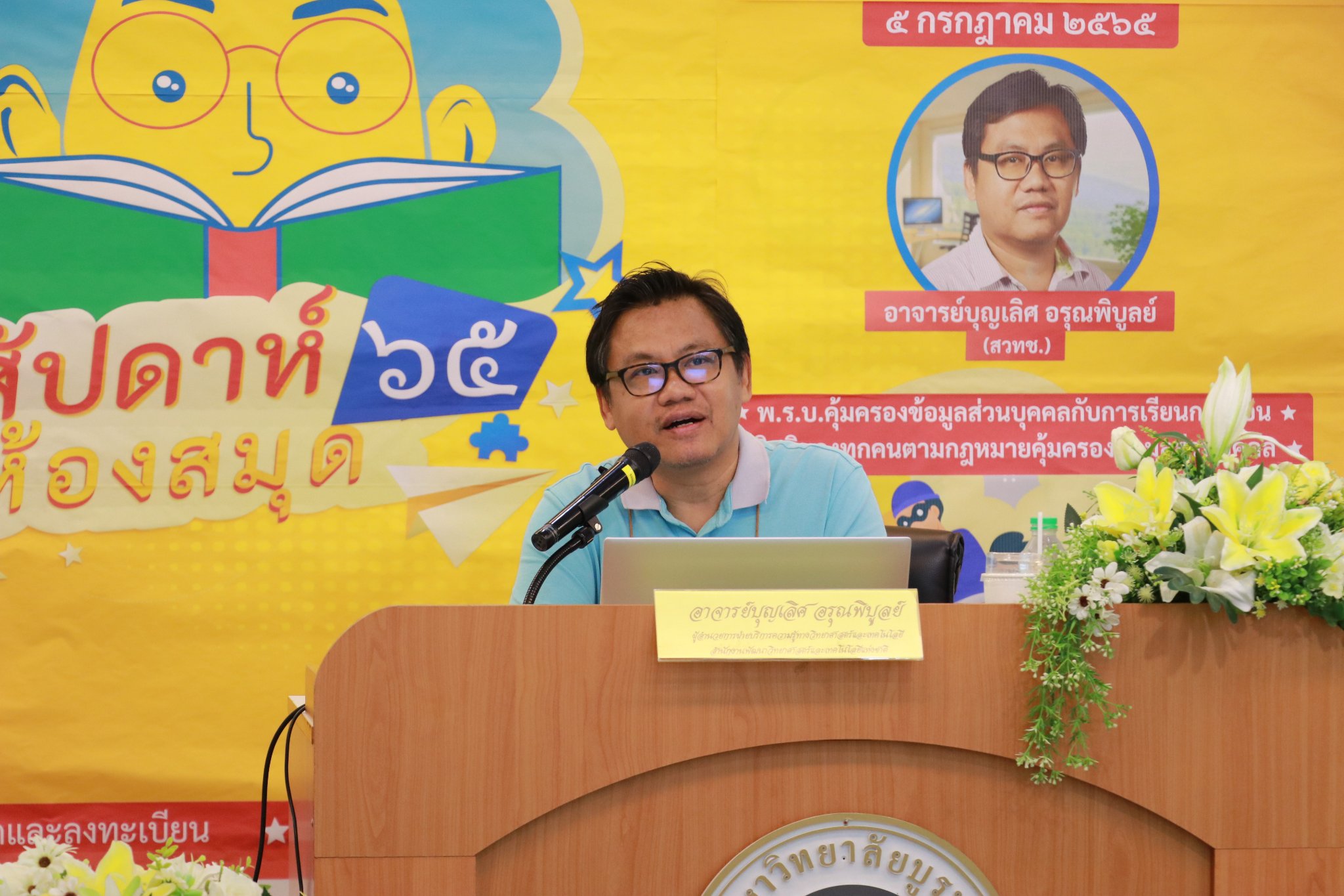 สำนักหอสมุด มหาวิทยาลัยบูรพา ได้จัดการบรรยายทางวิชาการ เรื่อง พ.ร.บ.คุ้มครองข้อมูลส่วนบุคคลกับการเรียนการสอน ภายใต้งานสัปดาห์ห้องสมุด ประจำปี 2565 โดยอาจารย์บุญเลิศ อรุณพิบูลย์ ผู้อำนวยการฝ่ายบริการความรู้ทางวิทยาศาสตร์และเทคโนโลยี (STKS) สำนักงานพัฒนาวิทยาศาสตร์และเทคโนโลยีแห่งชาติ (สวทช.) เมื่อวันที่ 5 กรกฎาคม 2565 เวลา 09.00 – 12.00 น. ณ ห้องประชุม 201 ชั้น 2 และผ่านระบบ Zoom meeting