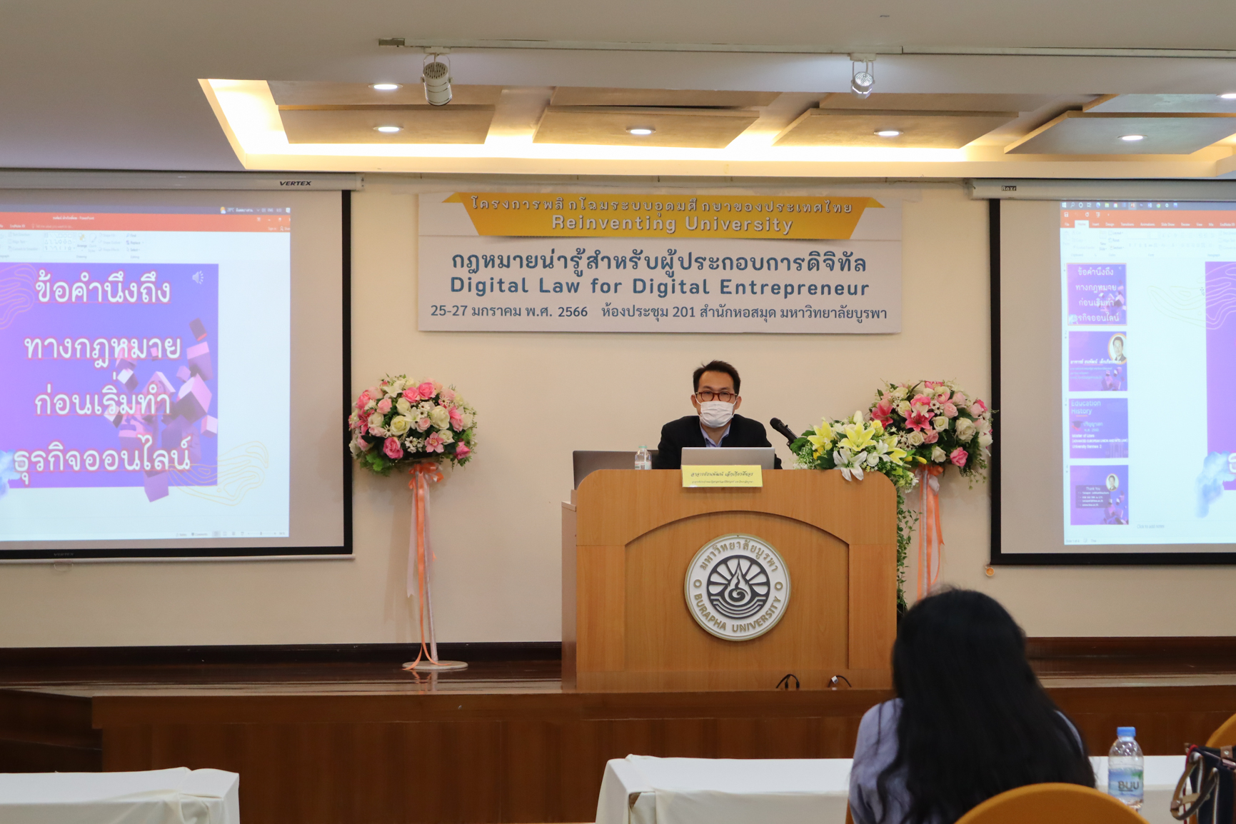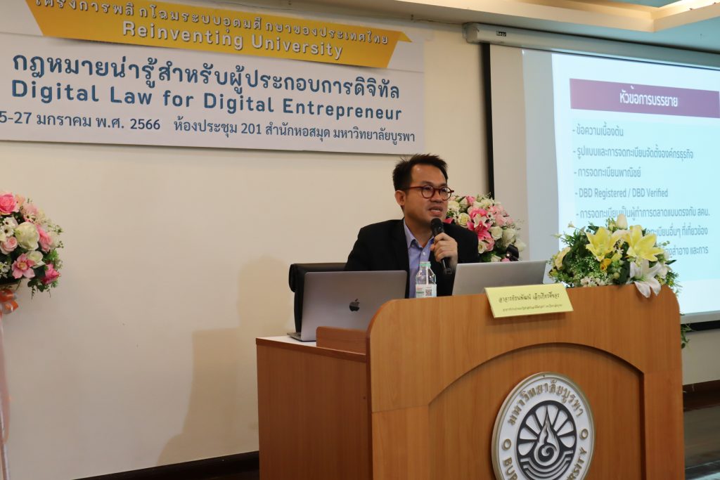 สำนักหอสมุด มหาวิทยาลัยบูรพา ได้จัดการอบรมหัวข้อ “ข้อคำนึงทางกฎหมายก่อนเริ่มทำธุรกิจออนไลน์” โดย อาจารย์ธนพัฒน์ เล็กเกียรติ์ขจร อาจารย์ประจำคณะรัฐศาสตร์และนิติศาสตร์ มหาวิทยาลัยบูรพา ในโครงการหลักสูตรฝึกอบรมระยะสั้น กฎหมายน่ารู้สำหรับผู้ประกอบการดิจิทัล (Digital Law for Digital Entrepreneur) เมื่อวันที่ 26 มกราคม 2566 เวลา 09.00 – 12.00 น.