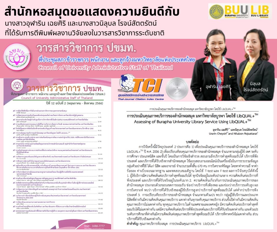 สำนักหอสมุด มหาวิทยาลัยบูรพา ขอแสดงความยินดีกับนางสาวอุฬาริน เฉยศิริ และนางสาวนิลุบล โรจน์สัตตรัตน์ ที่ได้รับตีพิมพ์ผลงานวิจัยในวารสารวิชาการระดับชาติ วารสารวิชาการ ปขมท. ปีที่ 12 ฉบับที่ 2 ประจำเดือน พฤษภาคม-สิงหาคม 2566 ฐานข้อมูล TCI 2 เรื่อง “การประเมินคุณภาพบริการของสำนักหอสมุด มหาวิทยาลัยบูรพา โดยใช้ LibQUAL+TM”