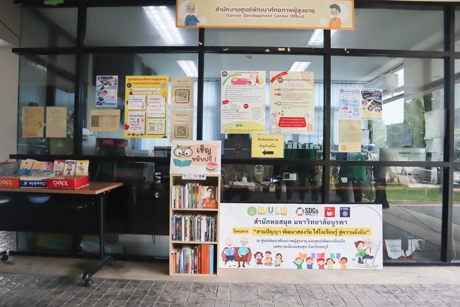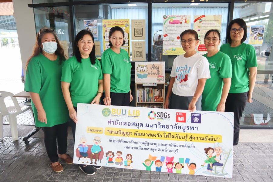 สำนักหอสมุดจัดโครงการ “สานปัญญา พัฒนาสองวัย ใส่ใจเรียนรู้ สู่ความยั่งยืน” ซึ่งเป็นโครงการสนับสนุนการพัฒนาห้องสมุดชุมชน และการบริการวิชาการแก่สังคมและชุมชนตามแนวทางการพัฒนาอย่างยั่งยืน เพื่อส่งเสริมการอ่าน การเรียนรู้และพัฒนาคุณภาพชีวิต สอดคล้องกับ SDG4 และ SDG17 โดยจัดทำห้องสมุดเพื่อส่งเสริมการอ่านและการเรียนรู้ตลอดชีวิต โดยดำเนินการคัดเลือกหนังสือที่สอดคล้องกับความต้องการของผู้สูงวัย จัดทำรายการบรรณานุกรมหนังสือ พร้อมนำเข้าสู่ระบบห้องสมุดอัตโนมัติ (MyLib)