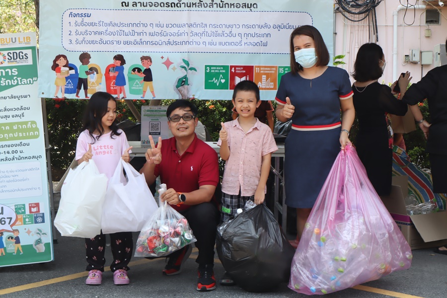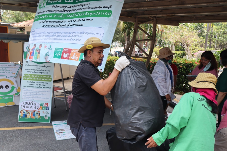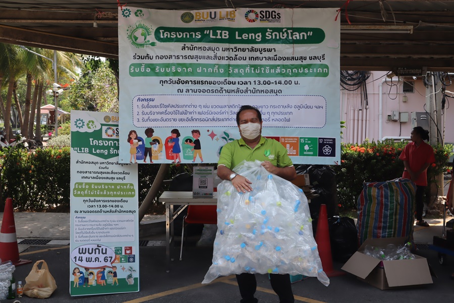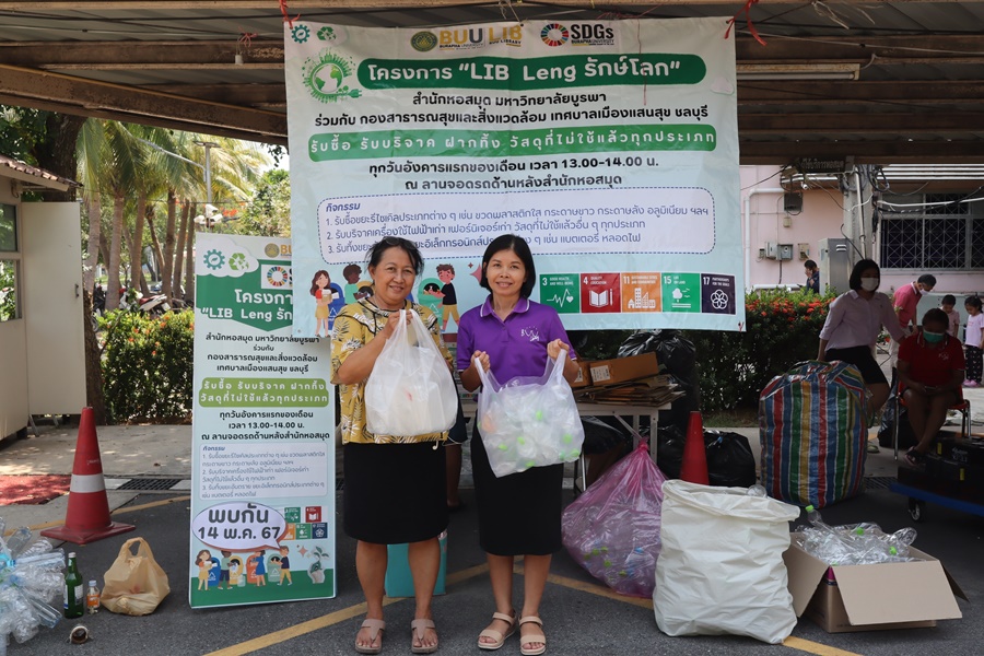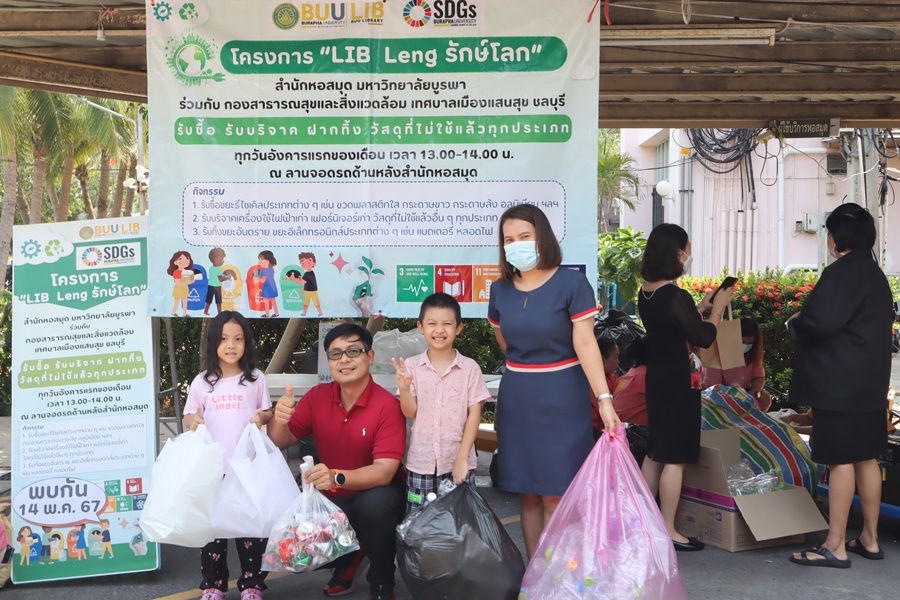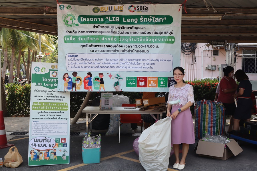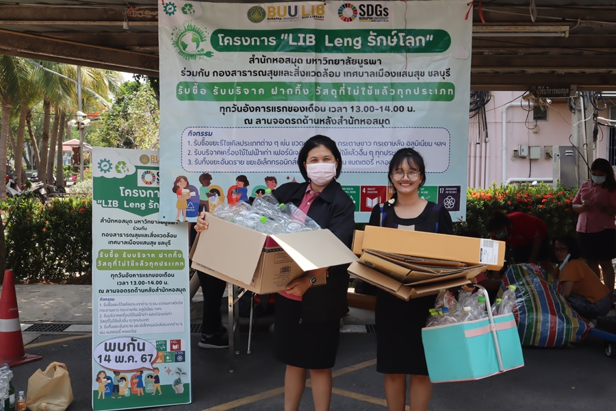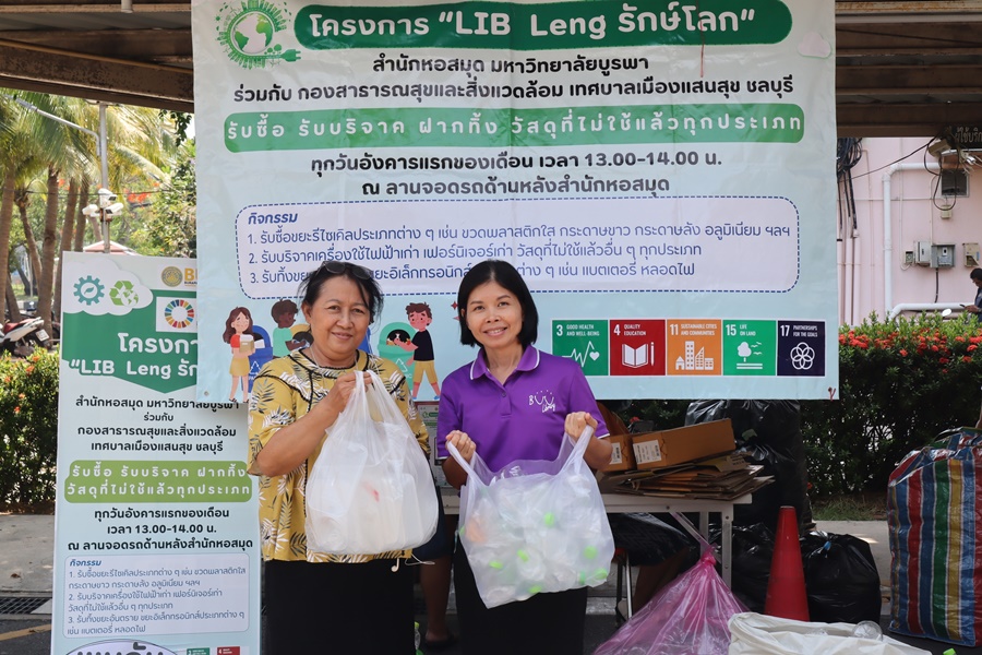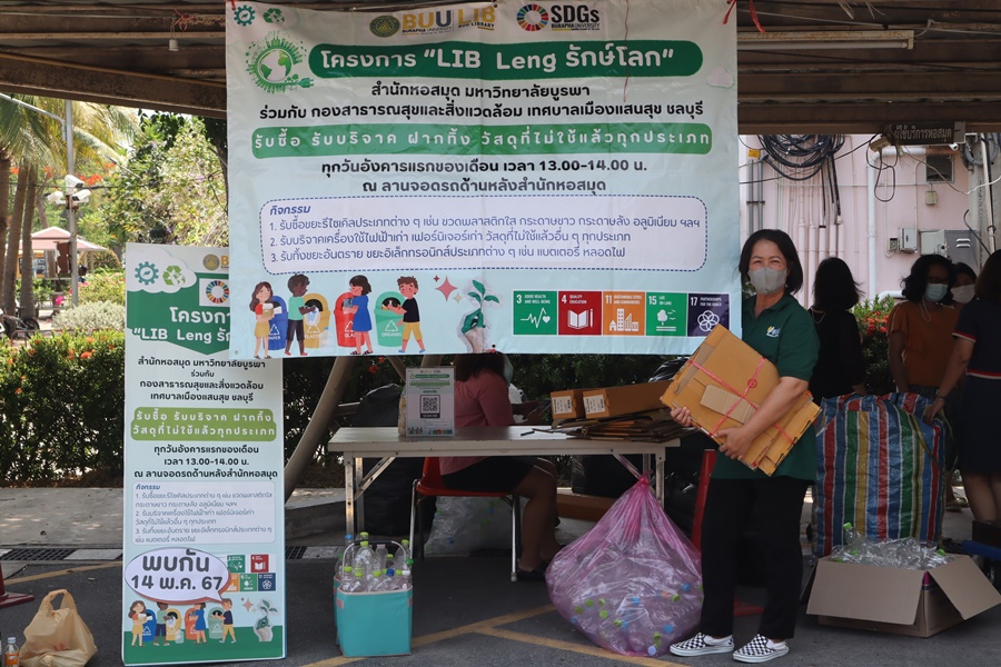 สำนักหอสมุด มหาวิทยาลัยบูรพา ร่วมกับกองสาธารณสุขและสิ่งแวดล้อม เทศบาลเมืองแสนสุข ชลบุรี จัดโครงการ “Lib Leng รักษ์โลก” โดยนำรถมารับซื้อขยะรีไซเคิลประเภทต่าง ๆ รับบริจาคเครื่องใช้ไฟฟ้าเก่า เฟอร์นิเจอร์เก่า วัสดุที่ไม่ใช้แล้ว และรับฝากทิ้งขยะอันตราย ขยะอิเล็กทรอนิกส์ประเภทต่าง ๆ ทุกประเภท โดยจัดกิจกรรมทุกวันอังคารแรกของเดือน เวลา 13.00-14.00 น. ณ ลานจอดรถด้านหลังสำนักหอสมุด