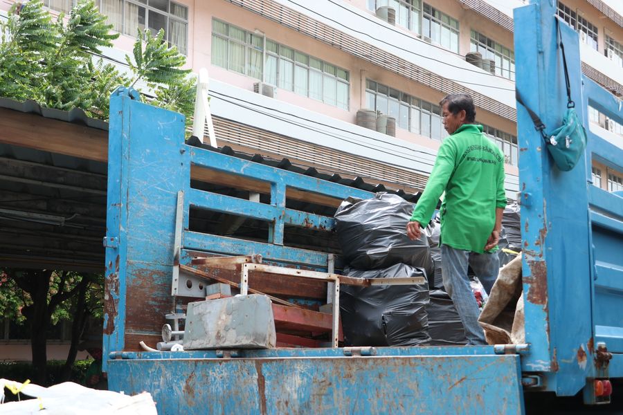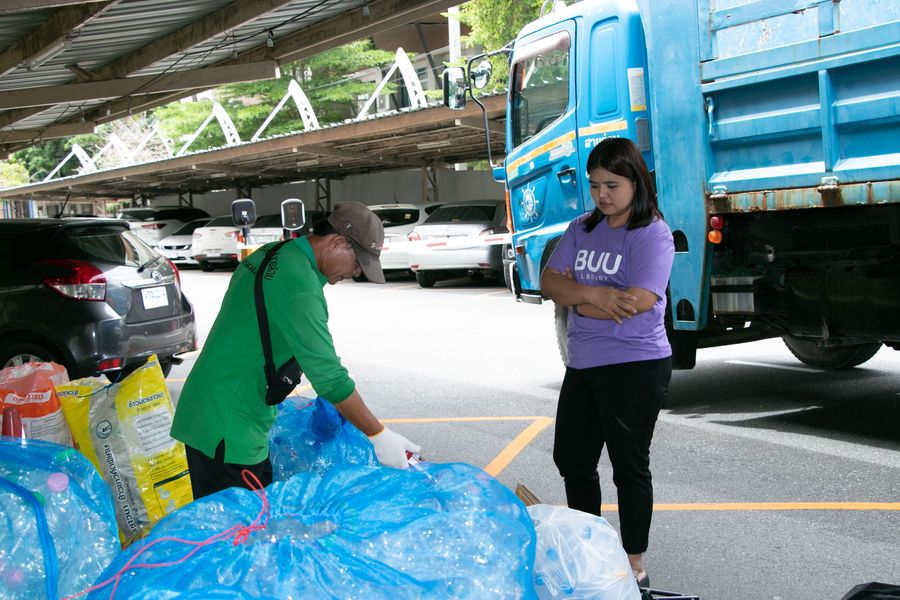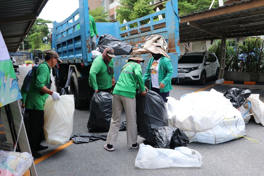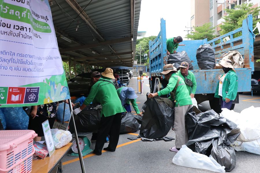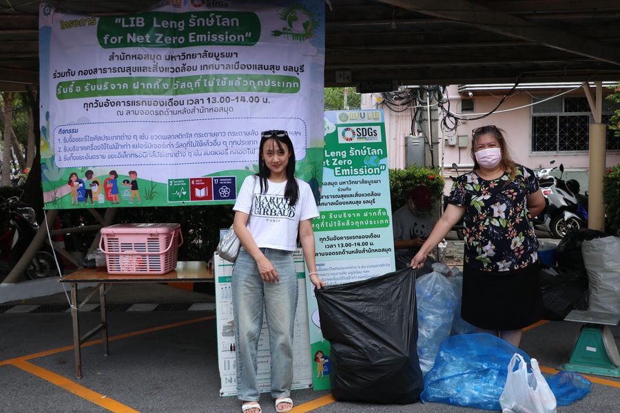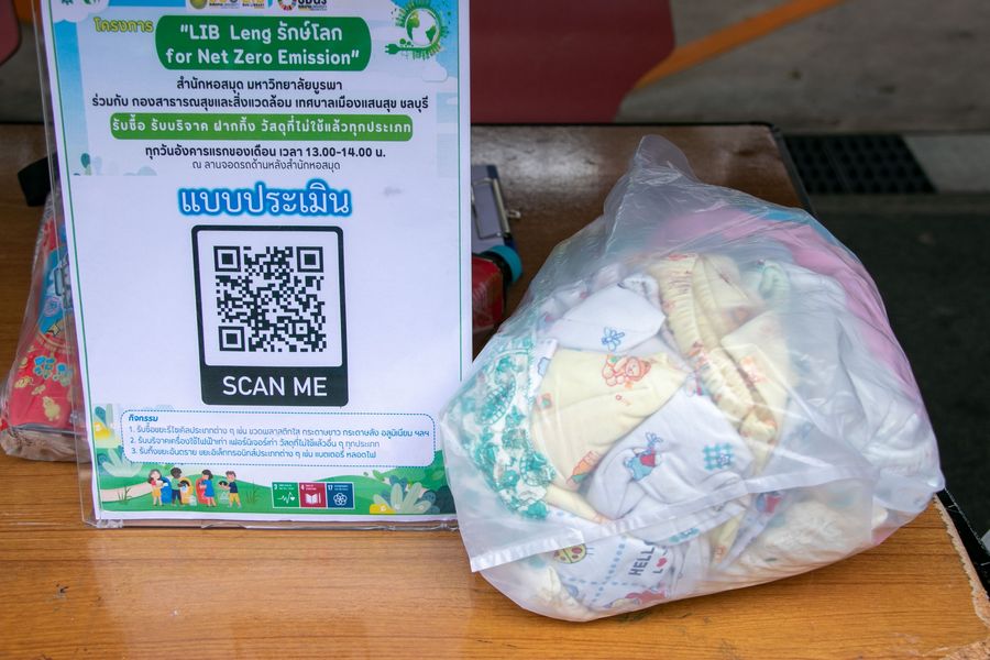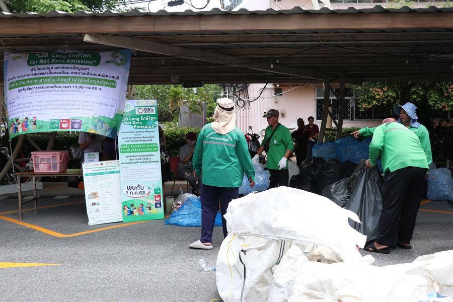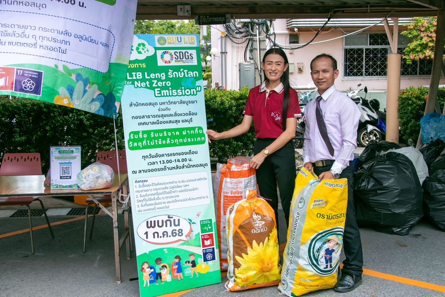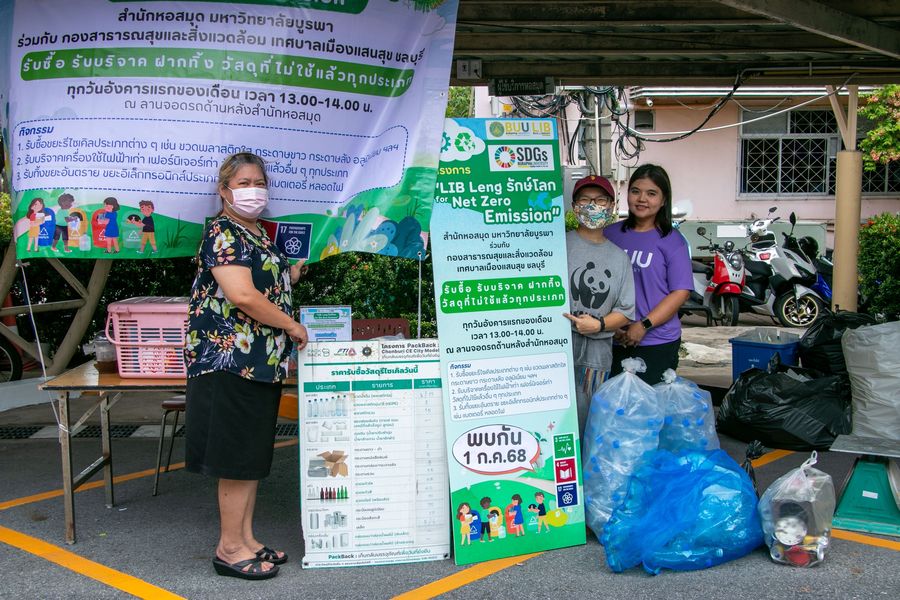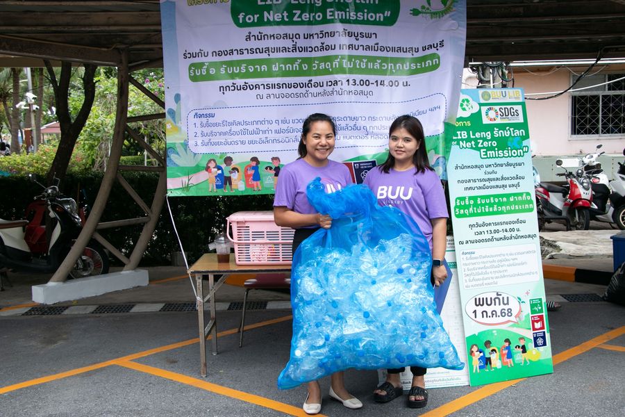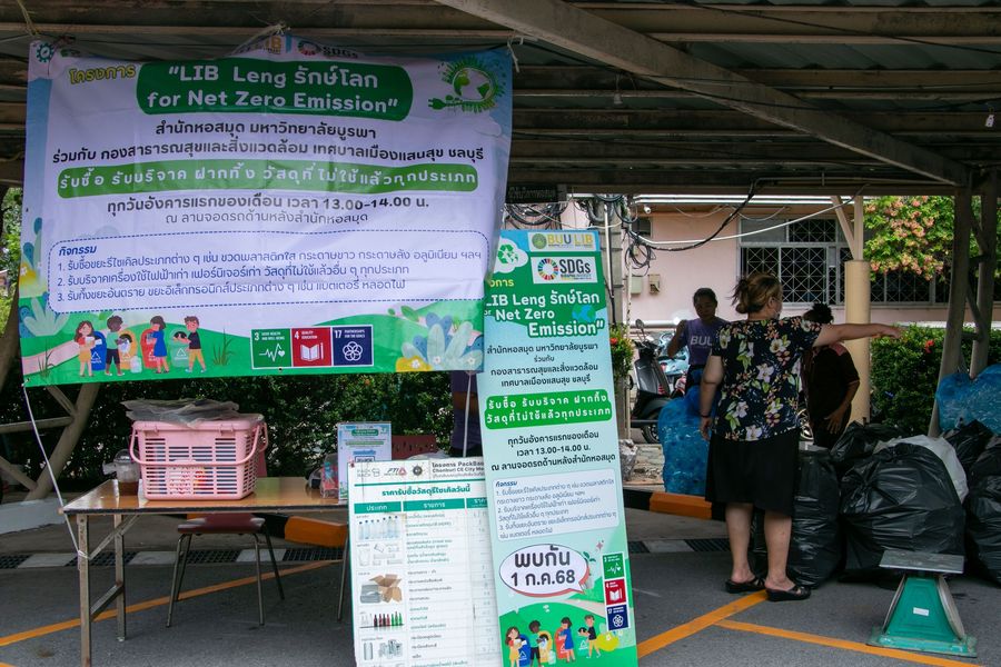 สำนักหอสมุด ร่วมกับกองสาธารณสุขและสิ่งแวดล้อม เทศบาลเมืองแสนสุขมารับซื้อรับบริจาค รับฝากทิ้งวัสดุที่ไม่ใช้แล้วทุกประเภท ในโครงการ Lib Leng รักษ์โลก for Net Zero Emission ประจำเดือนกรกฎาคม เมื่อวันที่ 1 กรกฎาคม 2568 ณ ลานจอดรถด้านหลังสำนักหอสมุด