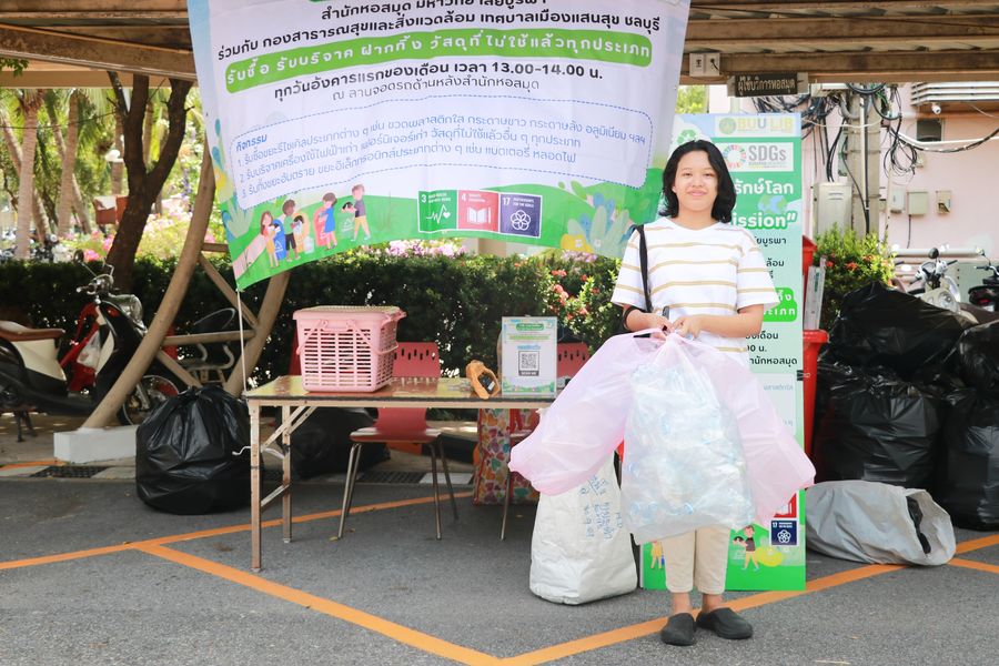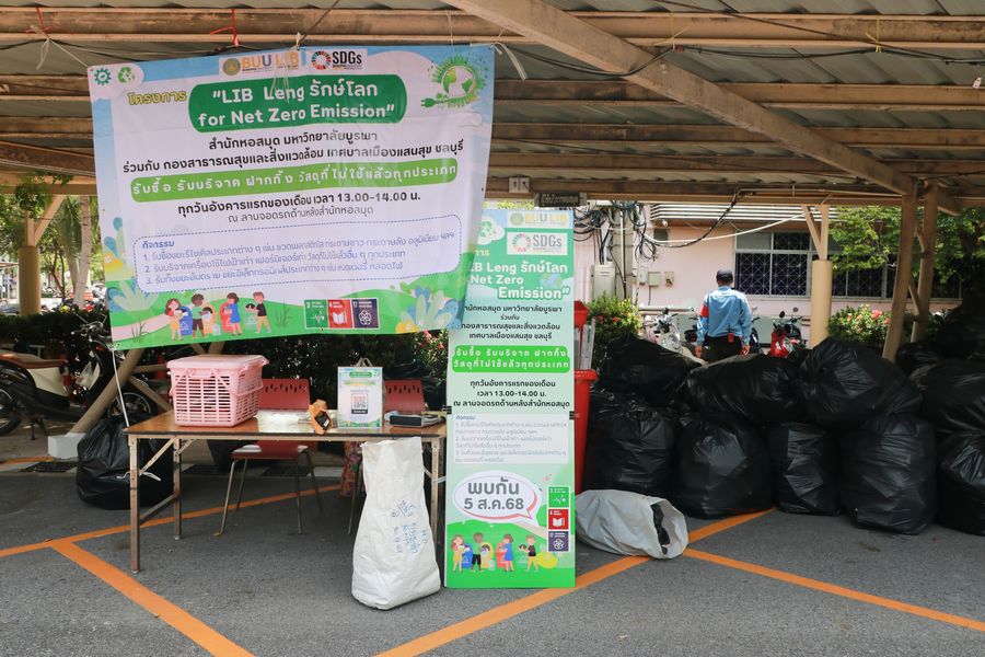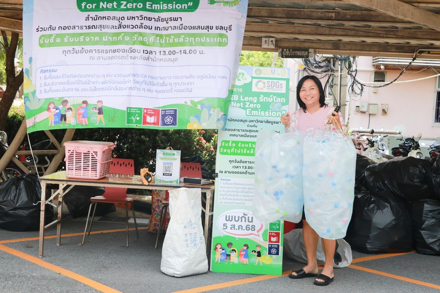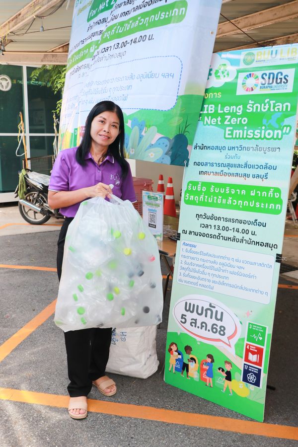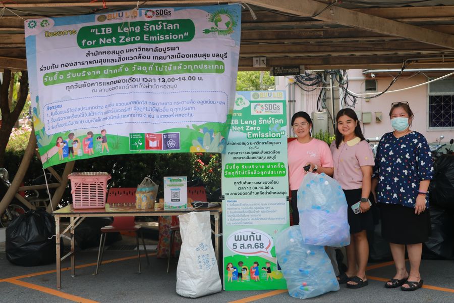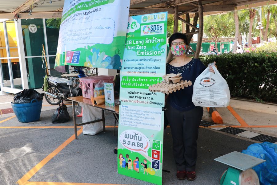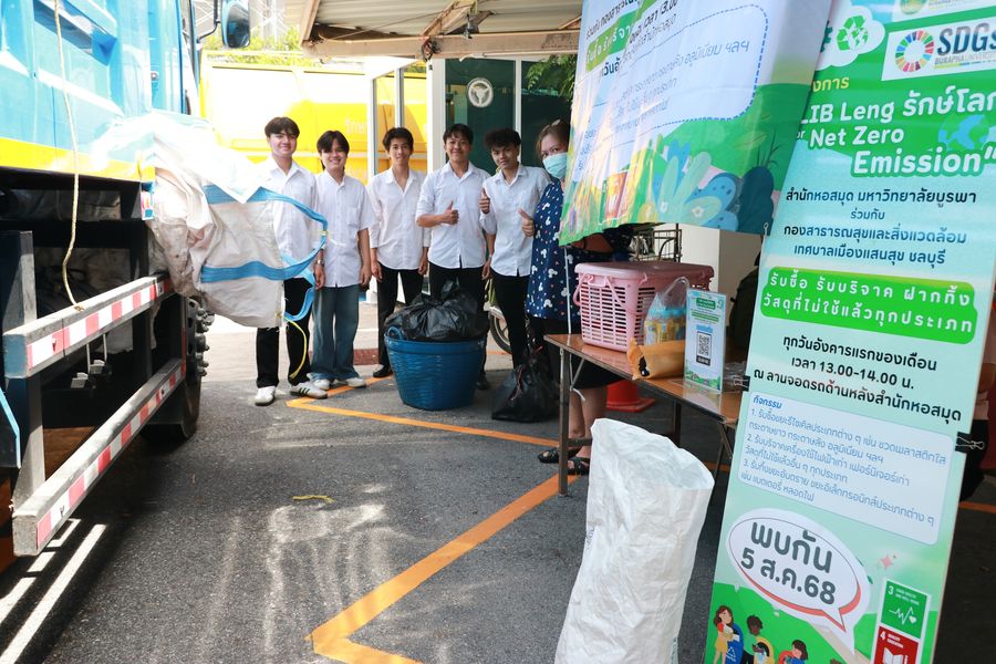 สำนักหอสมุด ร่วมกับกองสาธารณสุขและสิ่งแวดล้อม เทศบาลเมืองแสนสุขมารับซื้อรับบริจาค รับฝากทิ้งวัสดุที่ไม่ใช้แล้วทุกประเภท ในโครงการ Lib Leng รักษ์โลก for Net Zero Emission ประจำเดือนสิงหาคม เมื่อวันที่ 5 สิงหาคม 2568 ณ ลานจอดรถด้านหลังสำนักหอสมุด