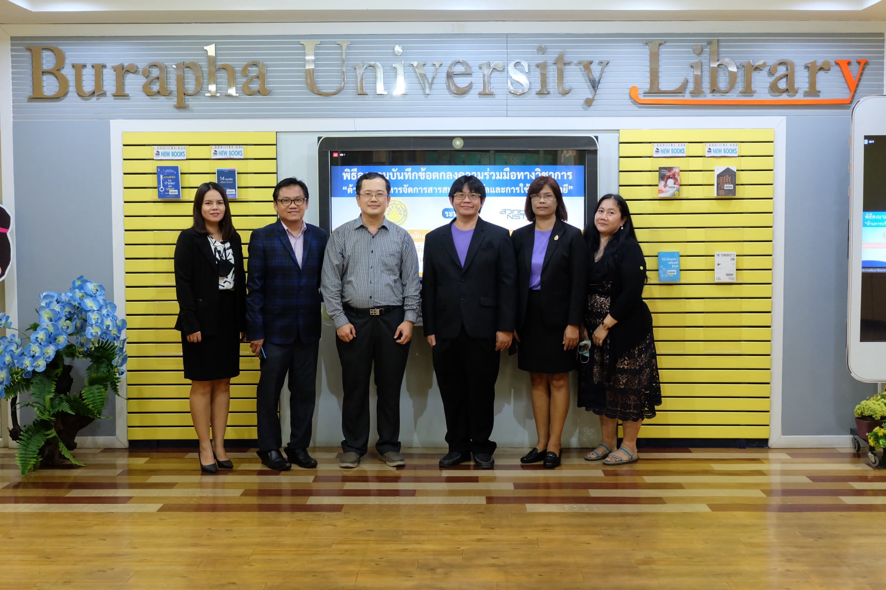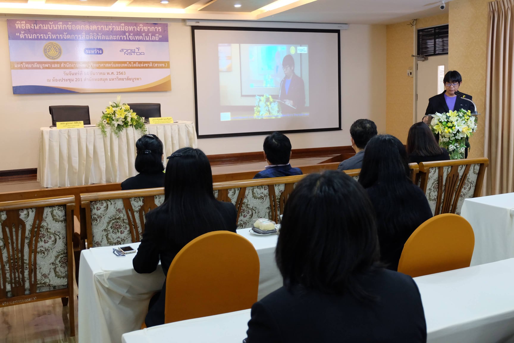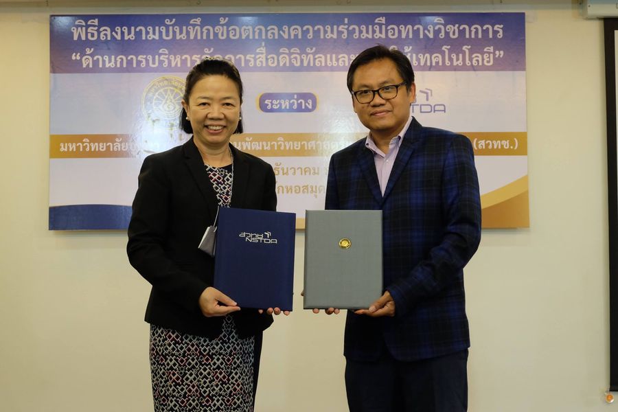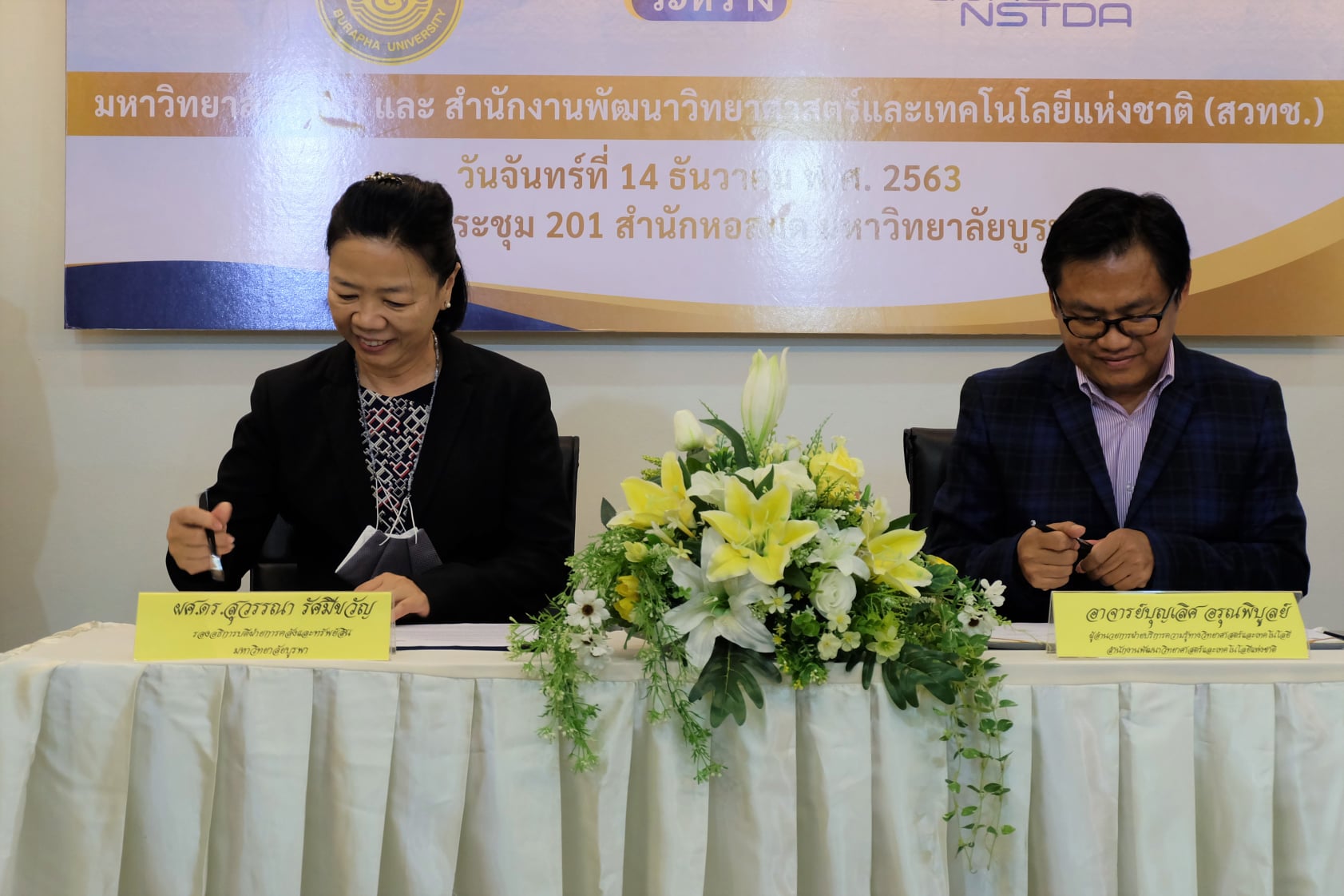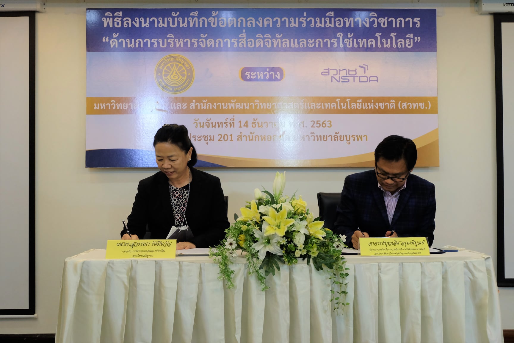 มหาวิทยาลัยบูรพา ร่วมกับสำนักงานพัฒนาวิทยาศาสตร์และเทคโนโลยีแห่งชาติ (สวทช.) จัดพิธีลงนามบันทึกข้อตกลงความร่วมมือทางวิชาการ ด้านการบริหารจัดการสารสนเทศดิจิทัลและการใช้เทคโนโลยี โดย ผศ.ดร. สุวรรณา รัศมีขวัญ รองอธิการบดีฝ่ายการคลังและทรัพย์สิน มหาวิทยาลัยบูรพา และอาจารย์บุญเลิศ อรุณพิบูลย์ ผู้อำนวยการฝ่ายบริการความรู้ทางวิทยาศาสตร์และเทคโนโลยี สำนักงานพัฒนาวิทยาศาสตร์และเทคโนโลยีแห่งชาติ (สวทช.) ให้เกียรติร่วมลงนามบันทึกข้อตกลง โดยมีอาจารย์เหมรัศมิ์ วชิรหัตถพงศ์ ผู้อำนวยการสำนักหอสมุด พร้อมผู้บริหาร ร่วมเป็นสักขีพยานในพิธีลงนามบันทึกข้อตกลง เมื่อวันจันทร์ที่ 14 ธันวาคม พ.ศ. 2563 ณ ห้องประชุม 201 สำนักหอสมุด
