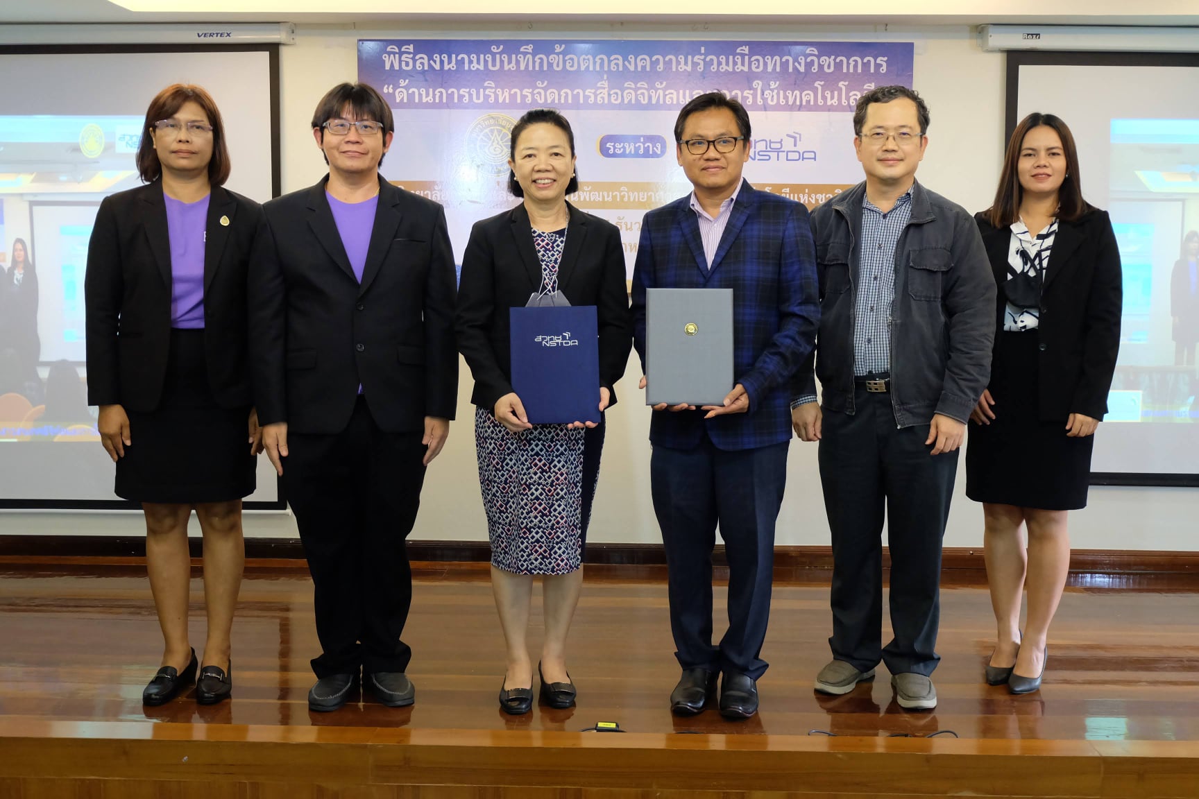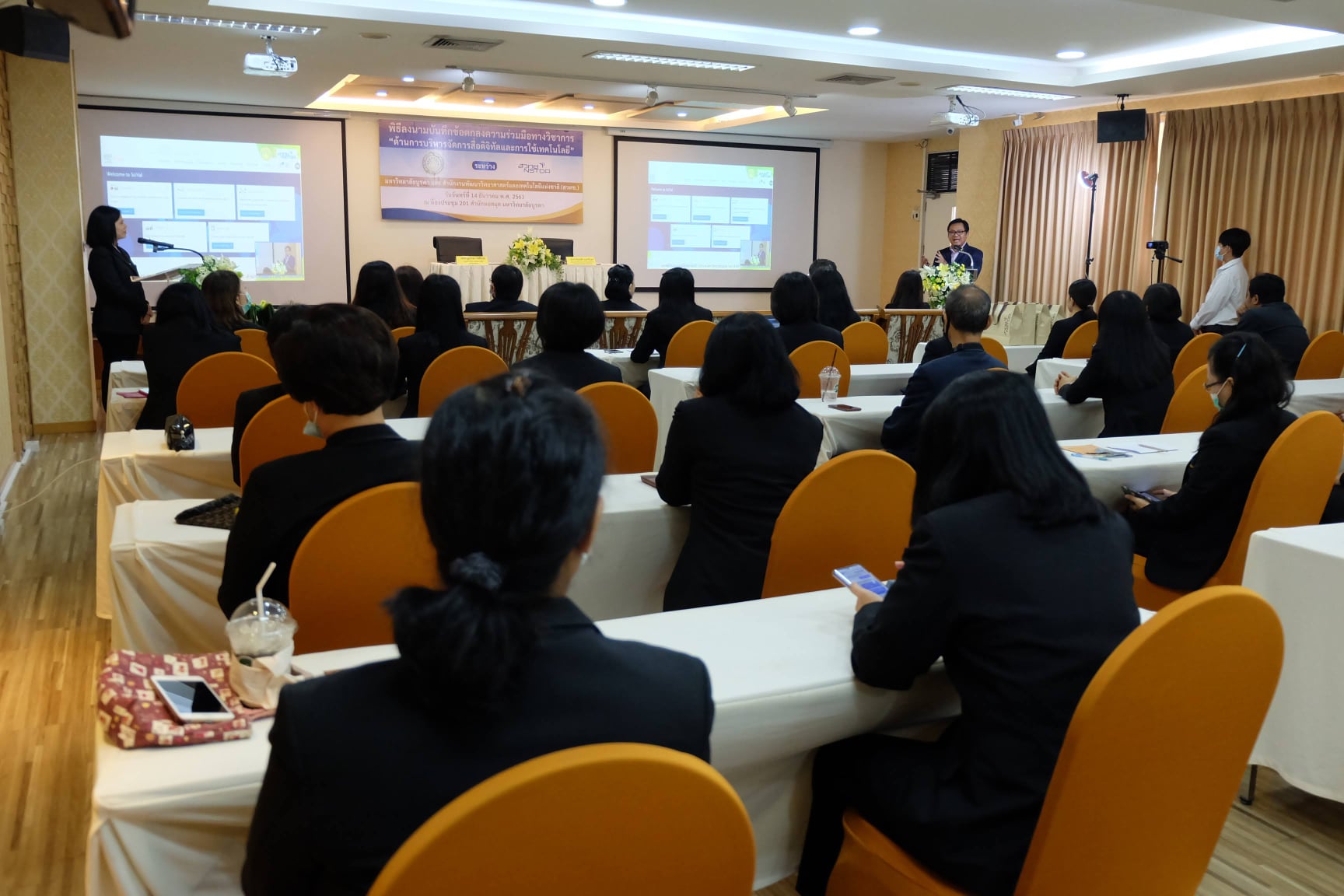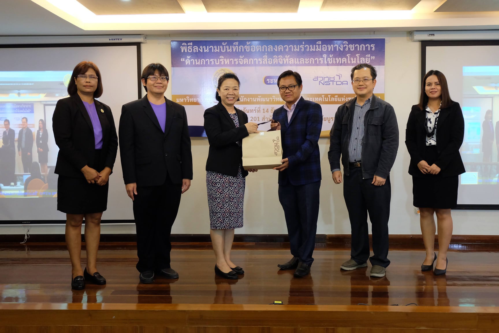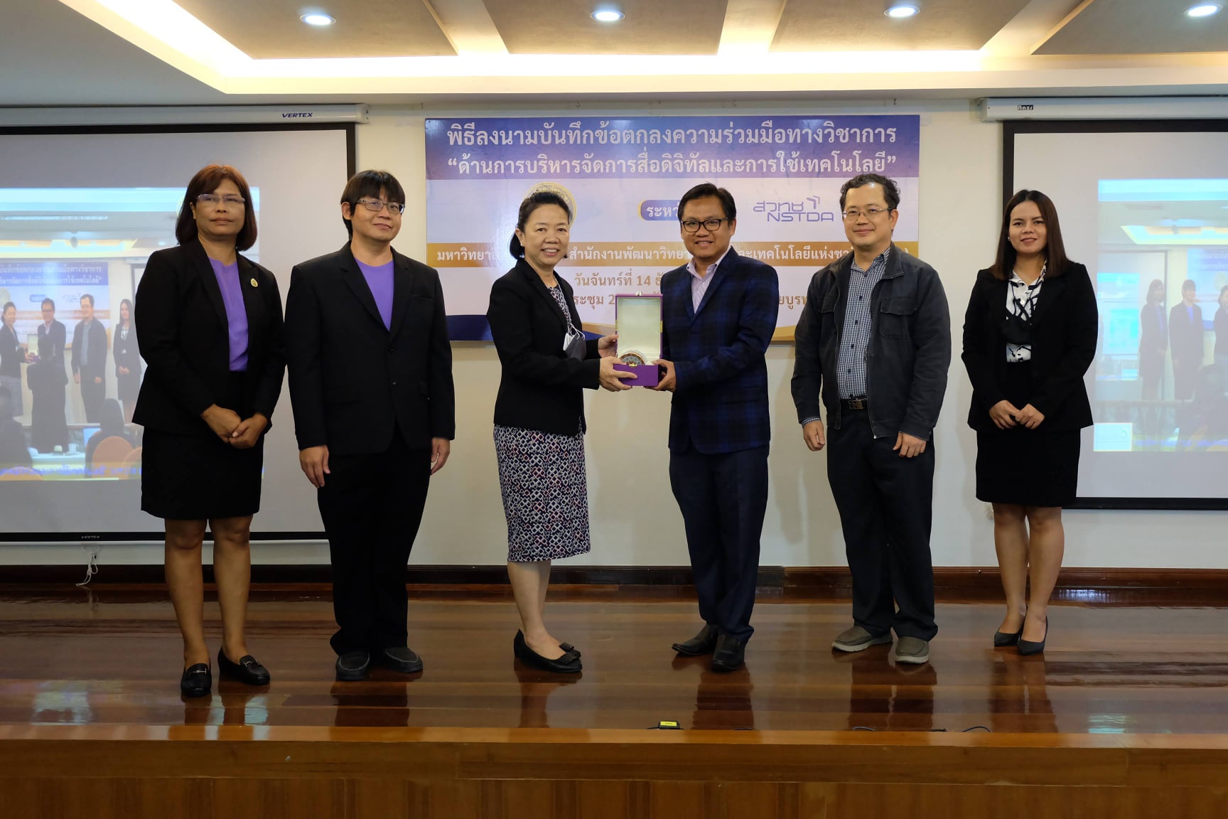มหาวิทยาลัยบูรพา ร่วมกับสำนักงานพัฒนาวิทยาศาสตร์และเทคโนโลยีแห่งชาติ (สวทช.) จัดพิธีลงนามบันทึกข้อตกลงความร่วมมือทางวิชาการ ด้านการบริหารจัดการสารสนเทศดิจิทัลและการใช้เทคโนโลยี โดย ผศ.ดร. สุวรรณา รัศมีขวัญ รองอธิการบดีฝ่ายการคลังและทรัพย์สิน มหาวิทยาลัยบูรพา และอาจารย์บุญเลิศ อรุณพิบูลย์ ผู้อำนวยการฝ่ายบริการความรู้ทางวิทยาศาสตร์และเทคโนโลยี สำนักงานพัฒนาวิทยาศาสตร์และเทคโนโลยีแห่งชาติ (สวทช.) ให้เกียรติร่วมลงนามบันทึกข้อตกลง โดยมีอาจารย์เหมรัศมิ์ วชิรหัตถพงศ์ ผู้อำนวยการสำนักหอสมุด พร้อมผู้บริหาร ร่วมเป็นสักขีพยานในพิธีลงนามบันทึกข้อตกลง เมื่อวันจันทร์ที่ 14 ธันวาคม พ.ศ. 2563 ณ ห้องประชุม 201 สำนักหอสมุด