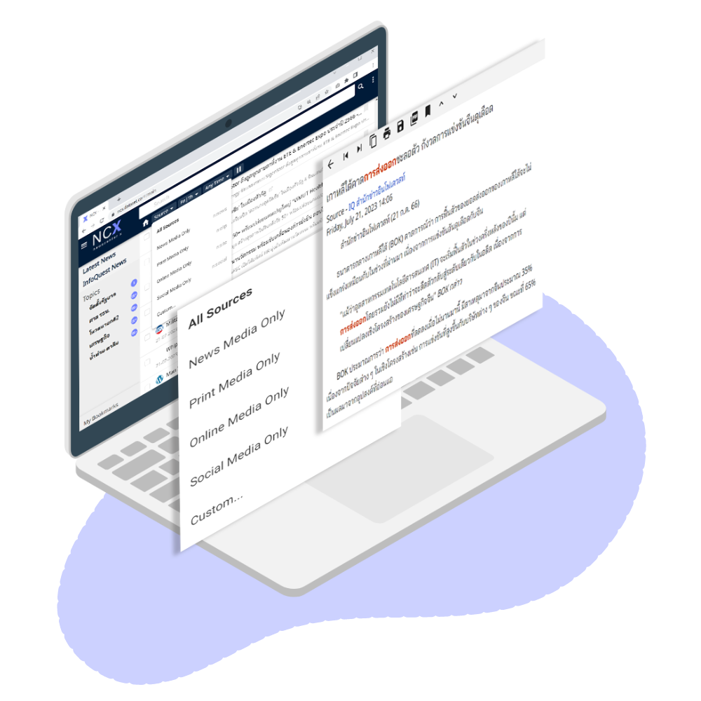 บริการกฤตภาคข่าวออนไลน์จากหนังสือพิมพ์และนิตยสารในประเทศทั้งภาษาไทยและภาษาอังกฤษมากกว่า 20 ฉบับ ครอบคลุมทุกหมวดข่าว เช่น การศึกษา ธุรกิจ ไอทีและสื่อสาร และอื่น ๆ รวบรวมข่าว บทความ โพสต์ ทวีต โพลล์ เว็บไซต์ทั้งในและต่างประเทศ แสดงผลลัพธ์เนื้อหาของข่าวบางส่วน และลิงก์เชื่อมโยงไปยังแหล่งข่าว รองรับการดูไฟล์ Word, Excel และ PDF และแชร์ข่าวสารไปยังแพลตฟอร์มโซเชียลมีเดียต่าง ๆ