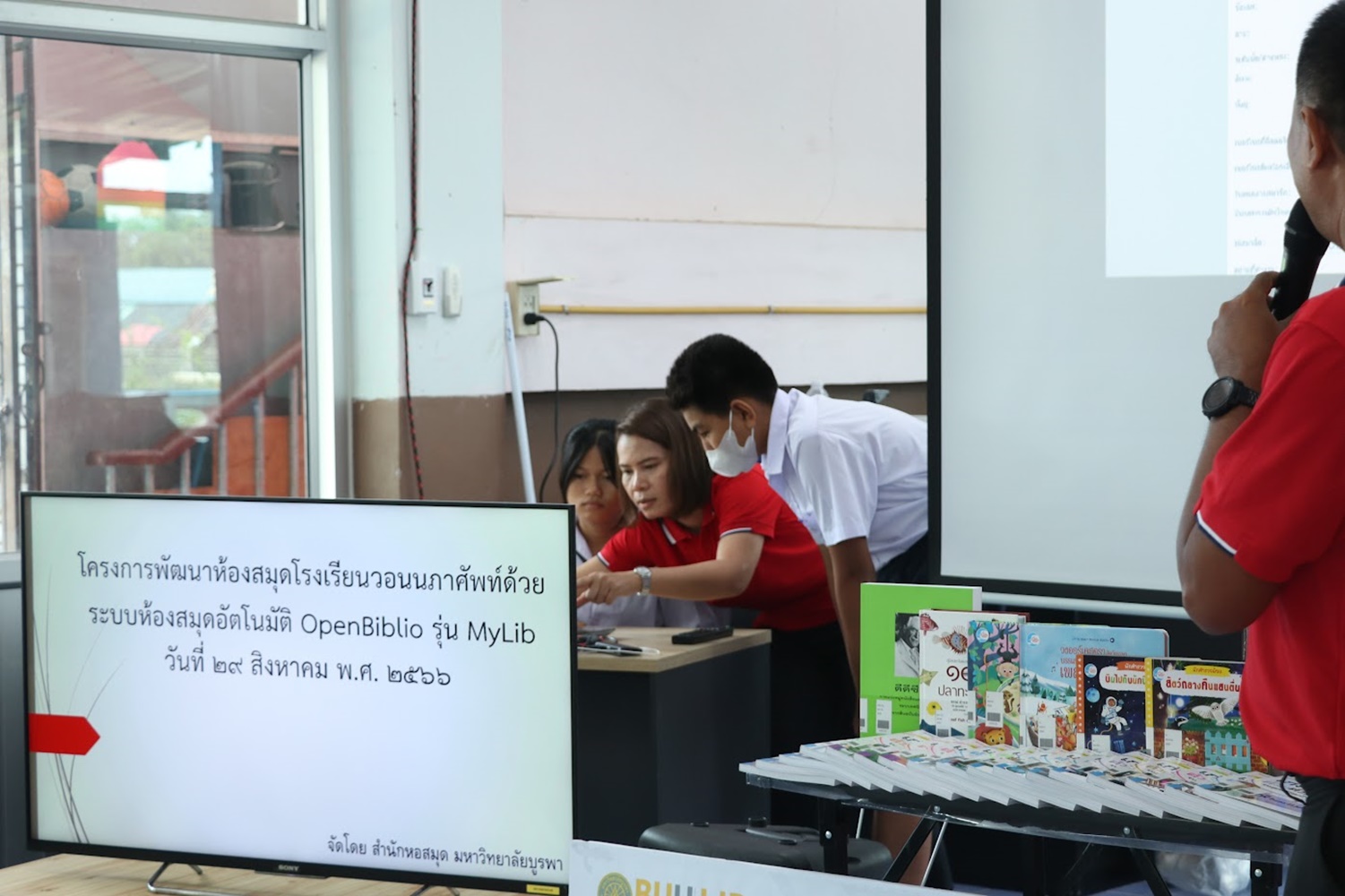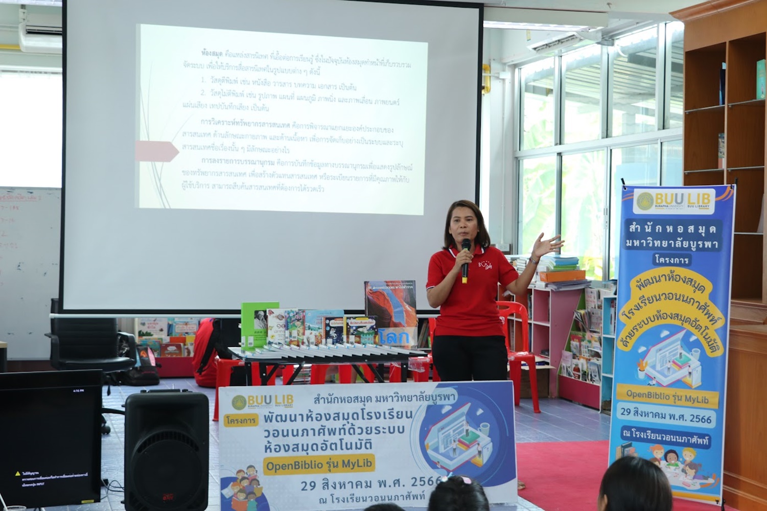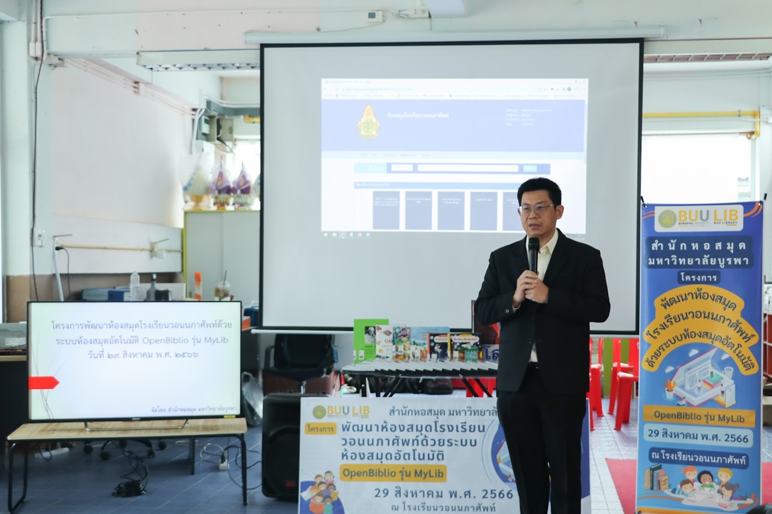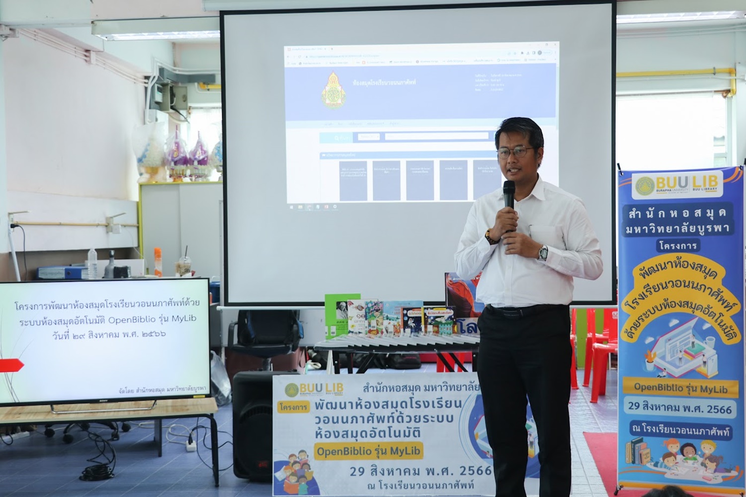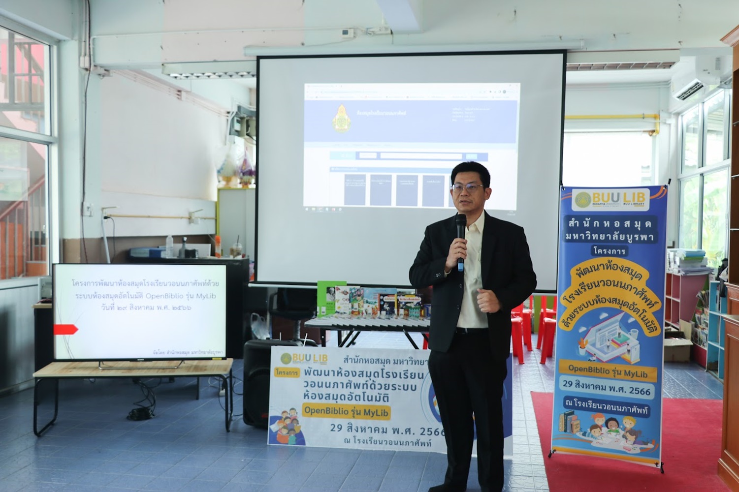 สำนักหอสมุด มหาวิทยาลัยบูรพา นำโดยอาจารย์เหมรัศมิ์ วชิรหัตถพงศ์ ผู้อำนวยการสำนักหอสมุด เป็นประธานกล่าวเปิดโครงการพัฒนาห้องสมุดโรงเรียนวอนนภาศัพท์ด้วยระบบห้องสมุดอัตโนมัติ OpenBiblio รุ่น MyLib เพื่อให้ผู้เข้าอบรมมีความรู้ความเข้าใจเกี่ยวกับการจัดการห้องสมุดโรงเรียน ระบบห้องสมุดอัตโนมัติ OpenBiblio รุ่น MyLib การลงรายการบรรณานุกรมหนังสือ และเพื่อเป็นแหล่งเรียนรู้ตลอดชีวิต เมื่อวันที่ 29 สิงหาคม 2566 ณ โรงเรียนวอนนภาศัพท์
