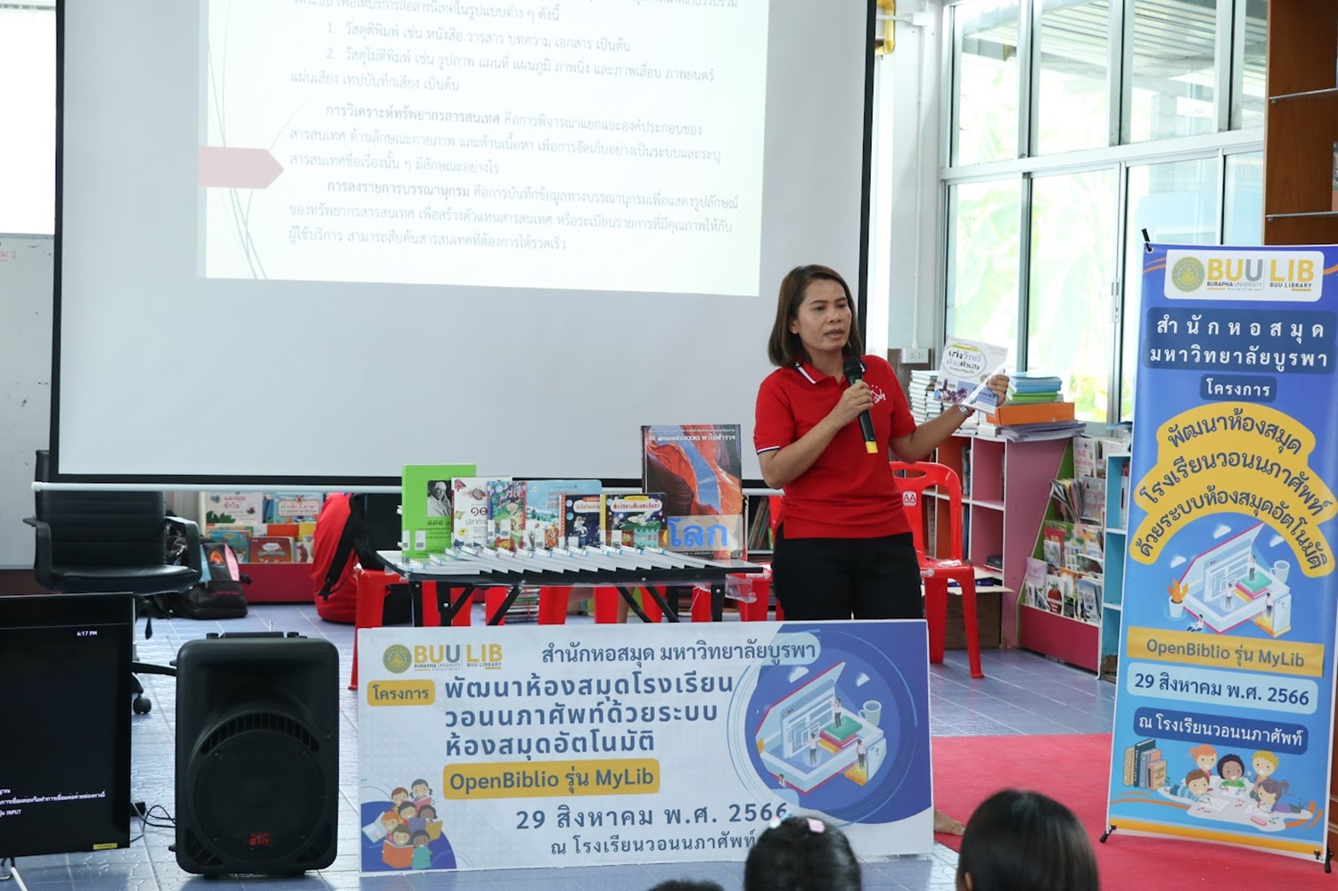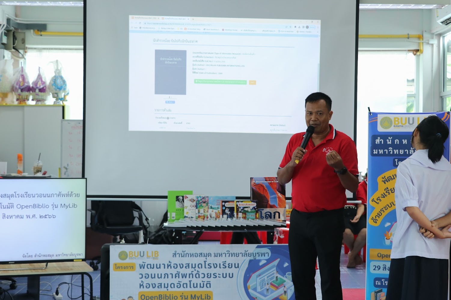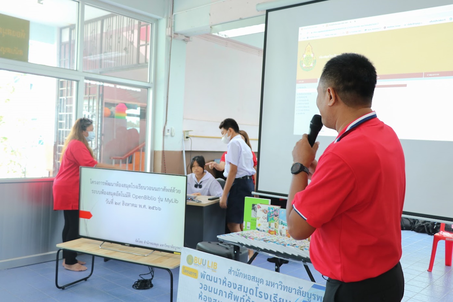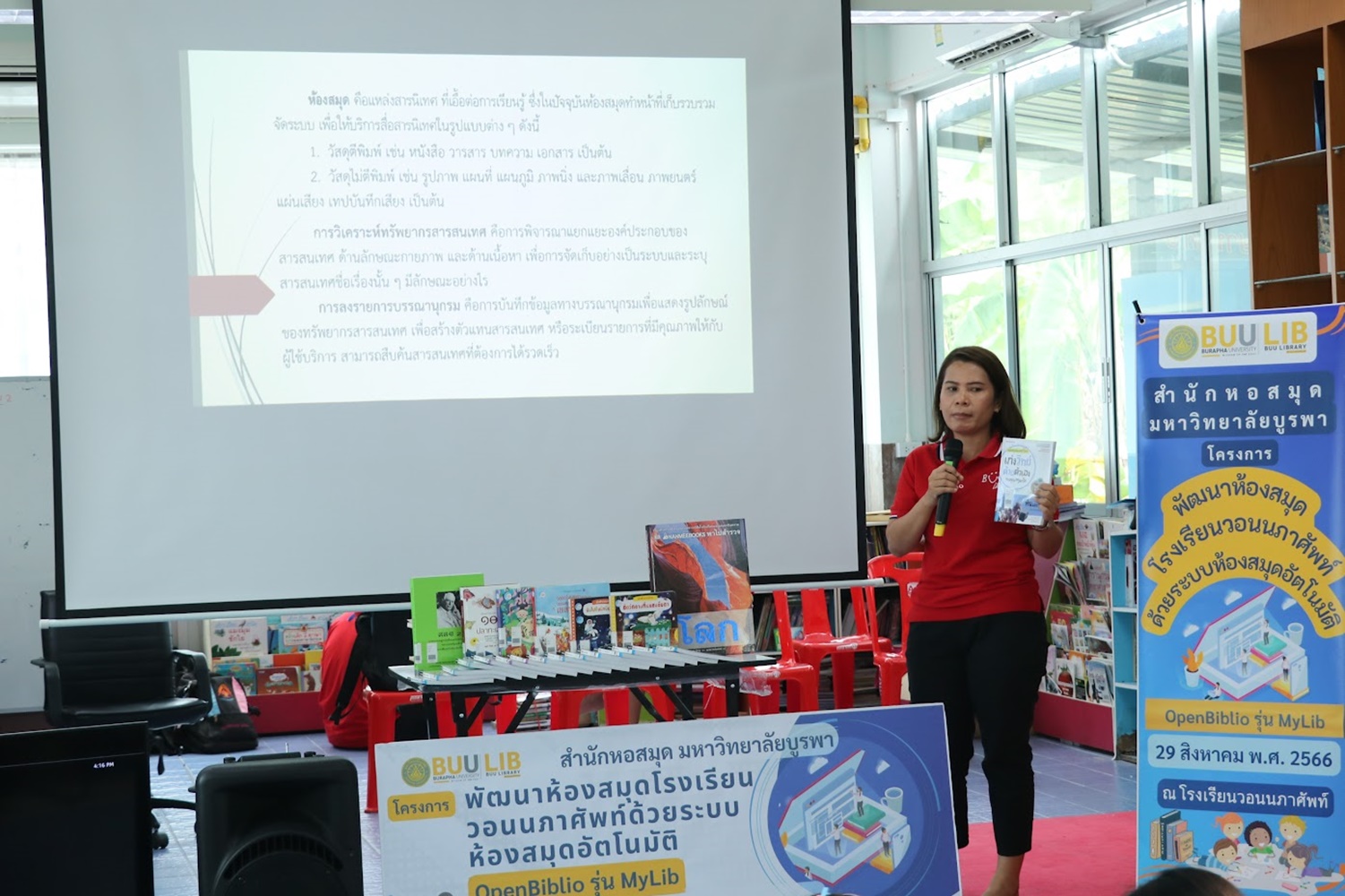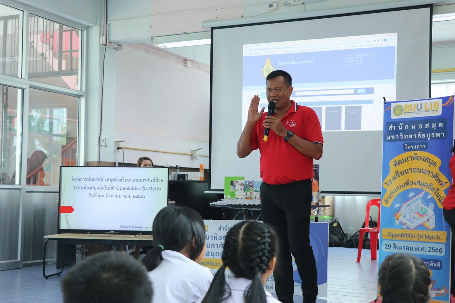 สำนักหอสมุด มหาวิทยาลัยบูรพา นำโดยอาจารย์เหมรัศมิ์ วชิรหัตถพงศ์ ผู้อำนวยการสำนักหอสมุด เป็นประธานกล่าวเปิดโครงการพัฒนาห้องสมุดโรงเรียนวอนนภาศัพท์ด้วยระบบห้องสมุดอัตโนมัติ OpenBiblio รุ่น MyLib เพื่อให้ผู้เข้าอบรมมีความรู้ความเข้าใจเกี่ยวกับการจัดการห้องสมุดโรงเรียน ระบบห้องสมุดอัตโนมัติ OpenBiblio รุ่น MyLib การลงรายการบรรณานุกรมหนังสือ และเพื่อเป็นแหล่งเรียนรู้ตลอดชีวิต เมื่อวันที่ 29 สิงหาคม 2566 ณ โรงเรียนวอนนภาศัพท์